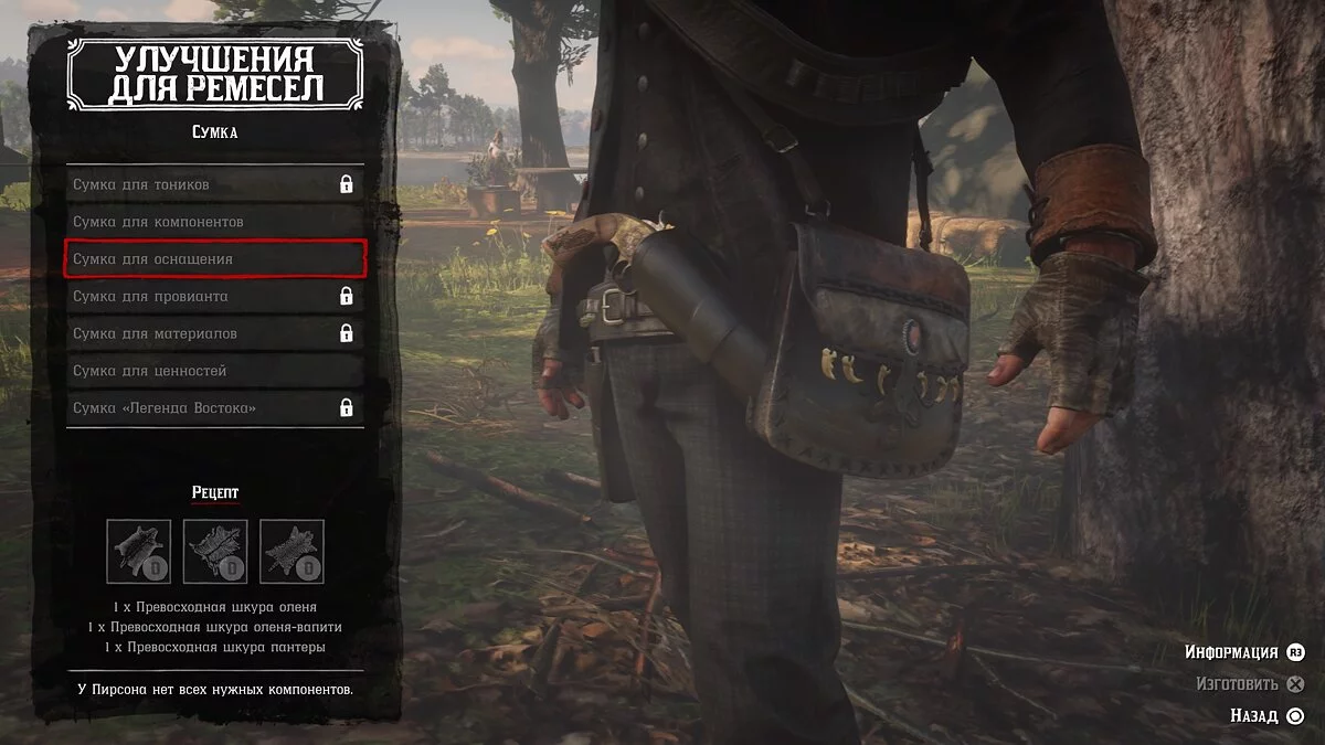 Для каждого улучшения требуется две шкуры прекрасного качества. О том, как правильно убить животное в RDR 2 и получить отличное качество убийства, читайте в нашем гайде по охоте. Итак, вот что нужно для крафта улучшения сумки: