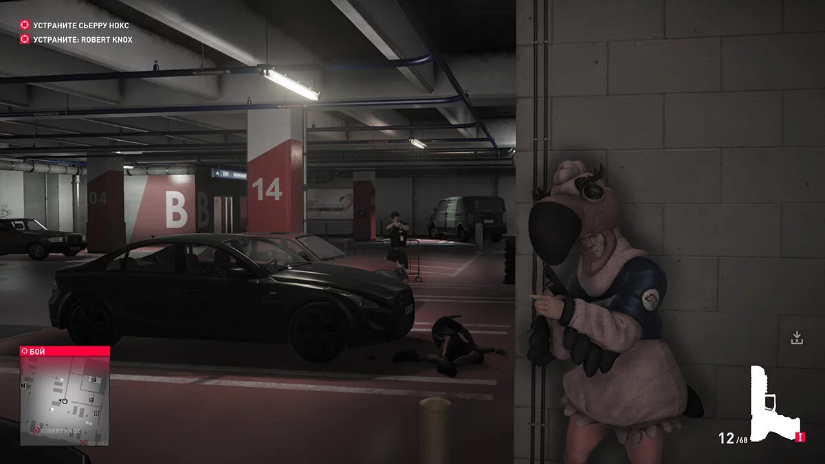 В любой момент можно перезапустить миссию, выбрав подходящую экипировку. Например, чемоданчик со снайперской винтовкой, яд, монеты для отвлечения внимания, отмычку или удавку.