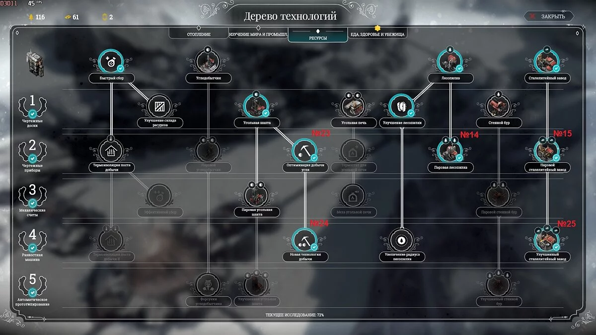 Поскольку буря налетит уже через 10 дней, то мастерские принципиально важны для выживания и регулярно должны работать в продленной и чрезвычайной сменах. Для прохождения первой бури нужно исследовать следующие технологии: