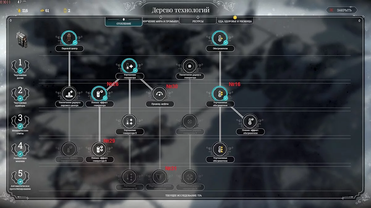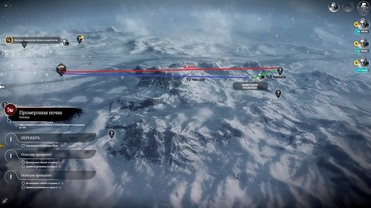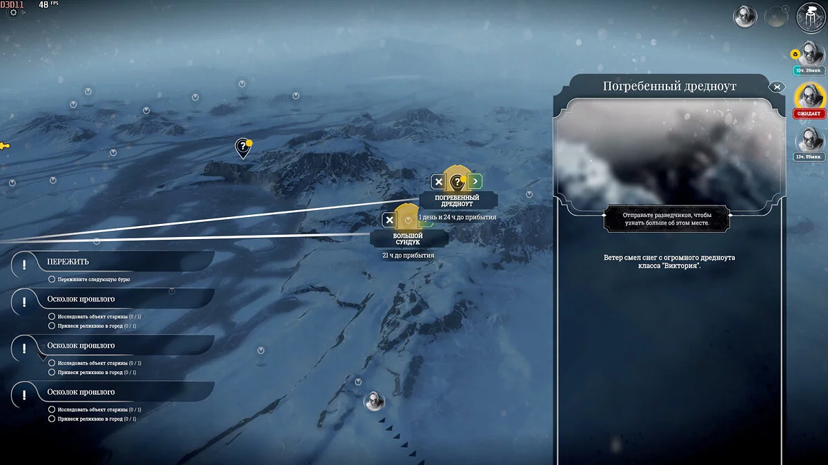 И только с 40 дня, то есть после четвертой бури, наберите разведчиков и отправьте их исследовать точки интереса. Займитесь фабрикой, автоматонами и протезами, а также теплицами. Не спешите исследовать дредноуты во льдах — лучше забирайте паровые ядра (обычно встречаются в паровых грузовиках, базах снабжения и разрушенных предприятиях) и людей.