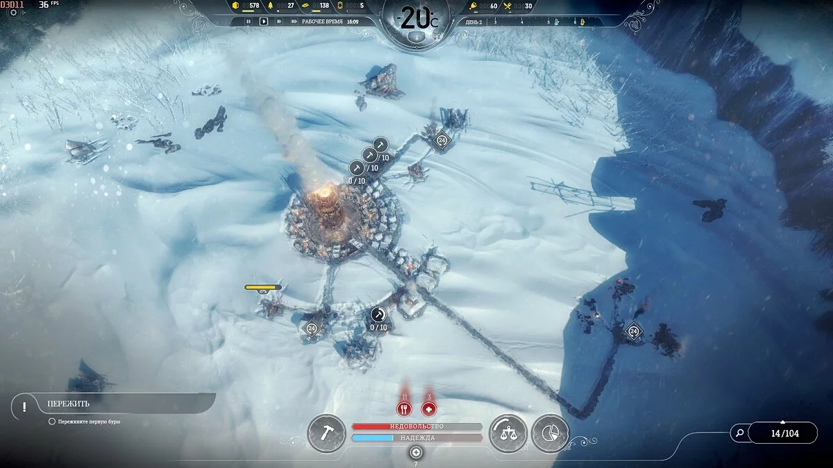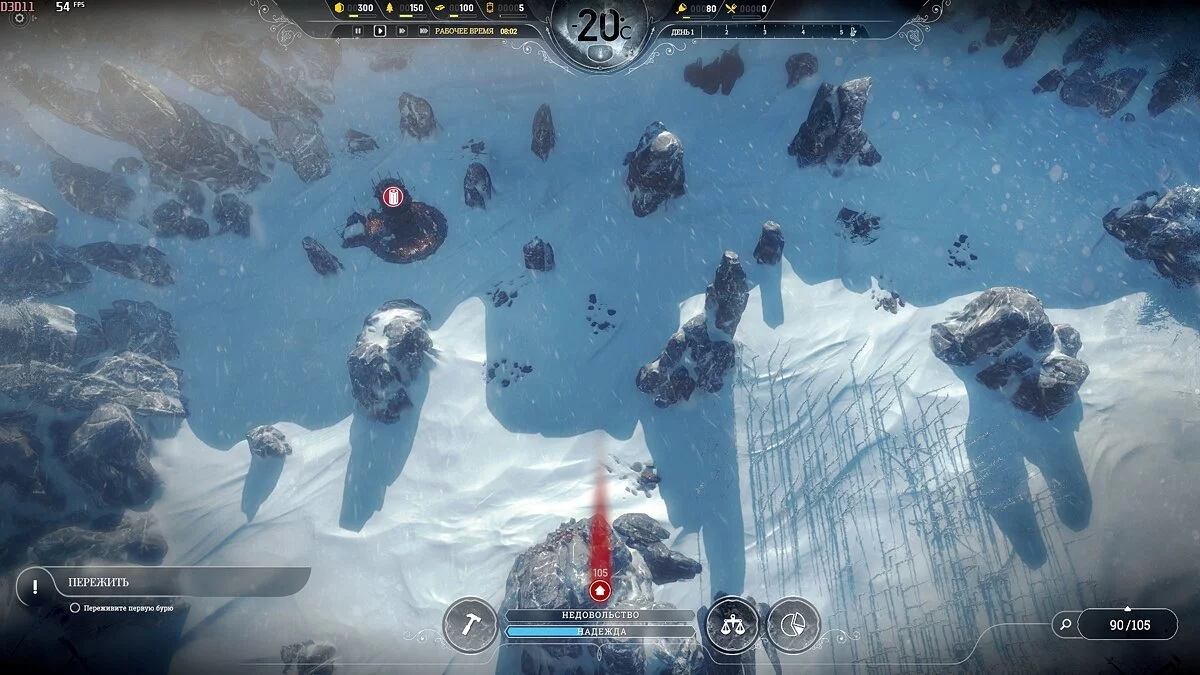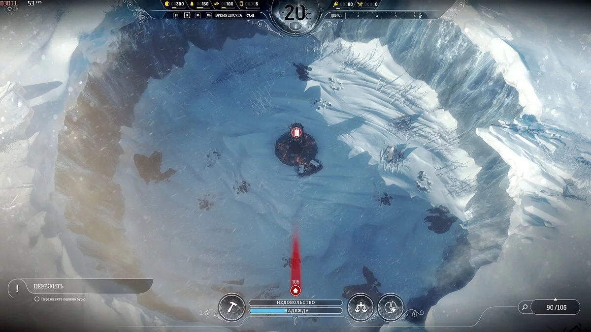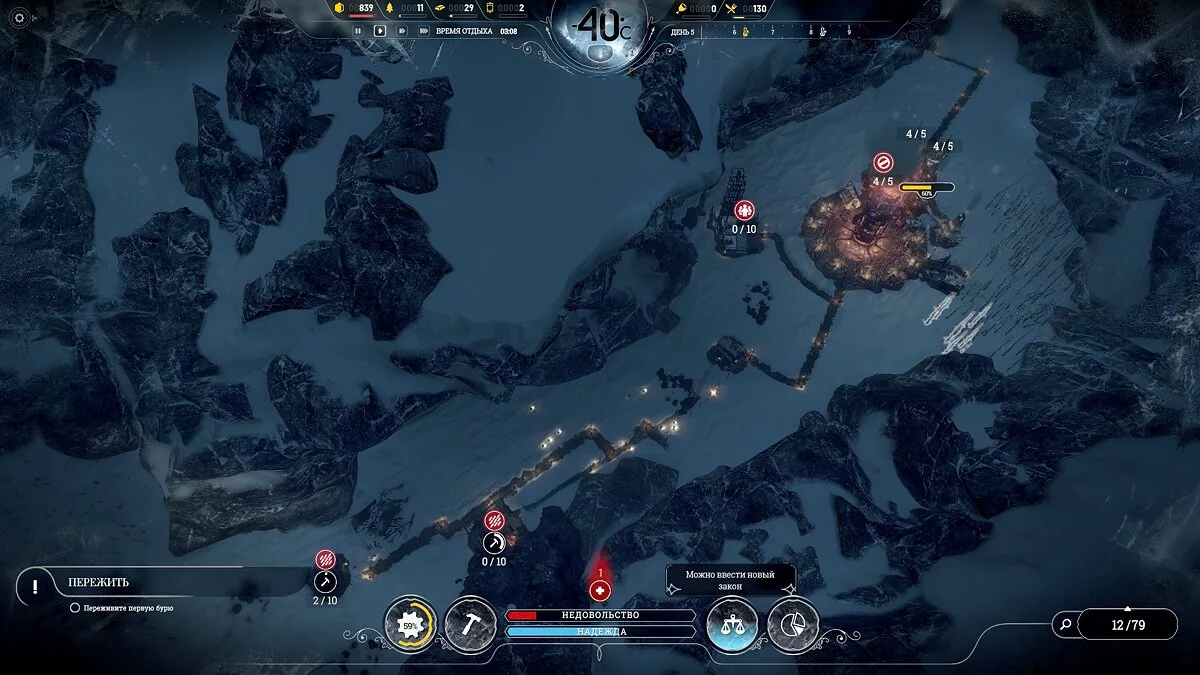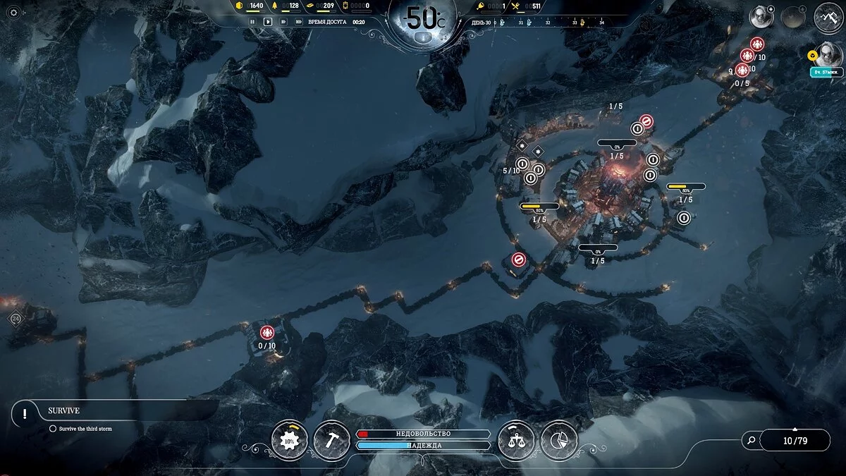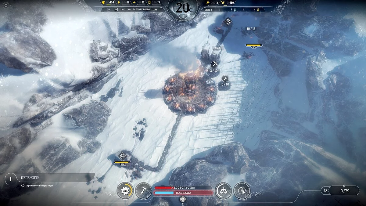 После темп сильно падает, поскольку приток беженцев уменьшается и половина карты, а то и больше, будет пустовать, так что остается только накапливать ресурсы. Бури на этой сложности идут один день 1 раз в 2 недели, понижают температуру на 2-3 пункта, обычная температура -40°С и она всегда восстанавливается.
