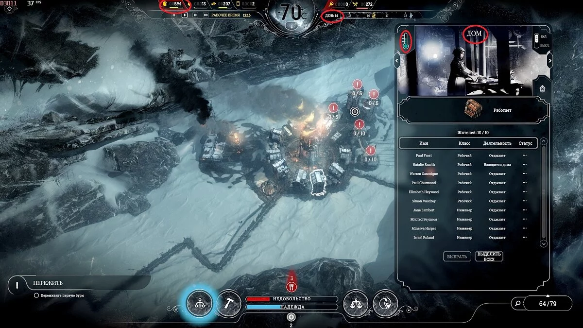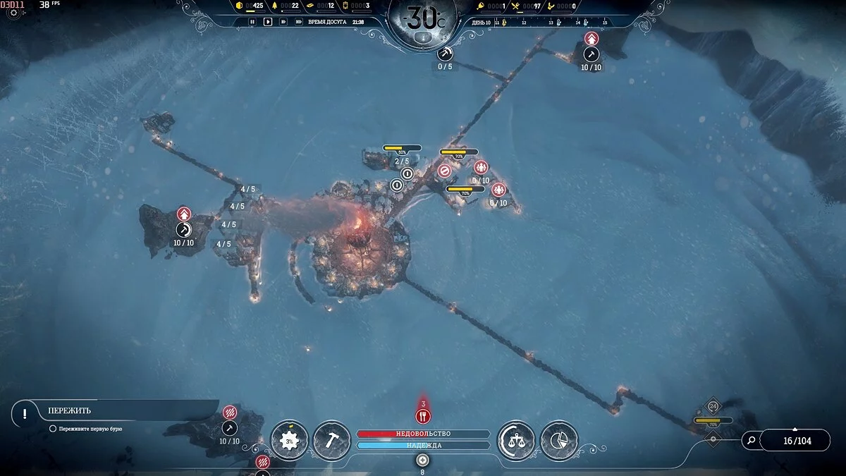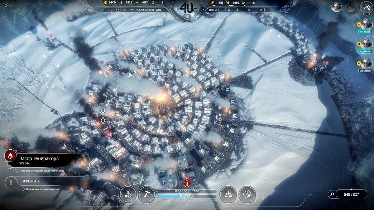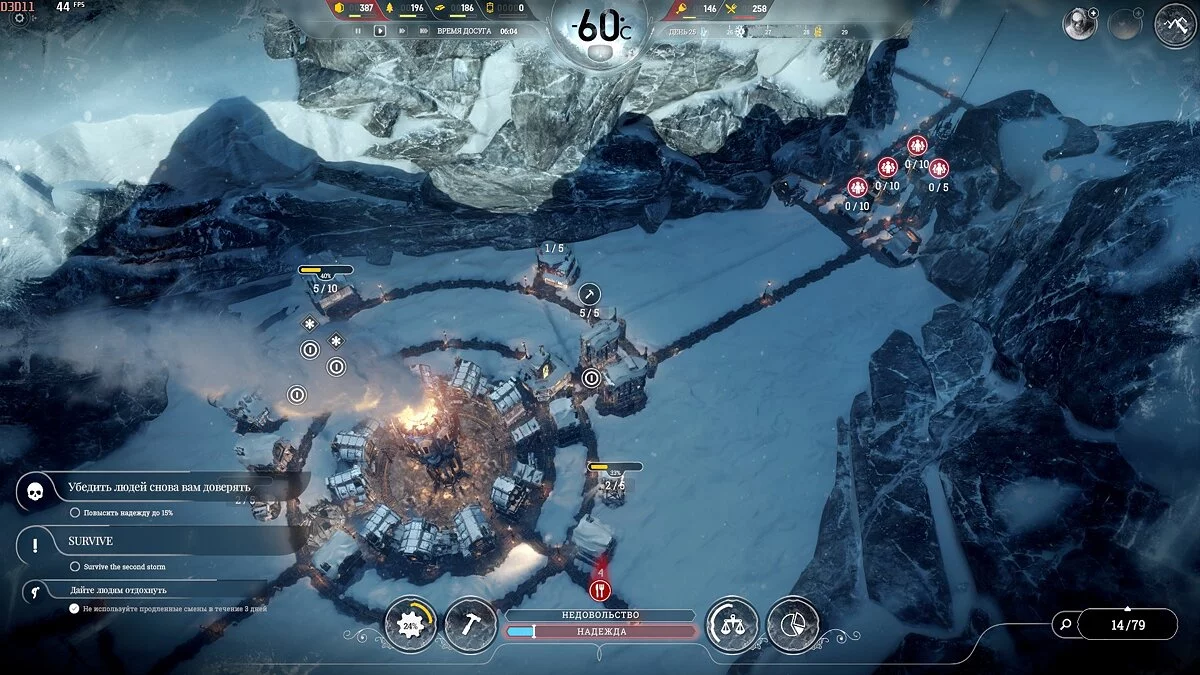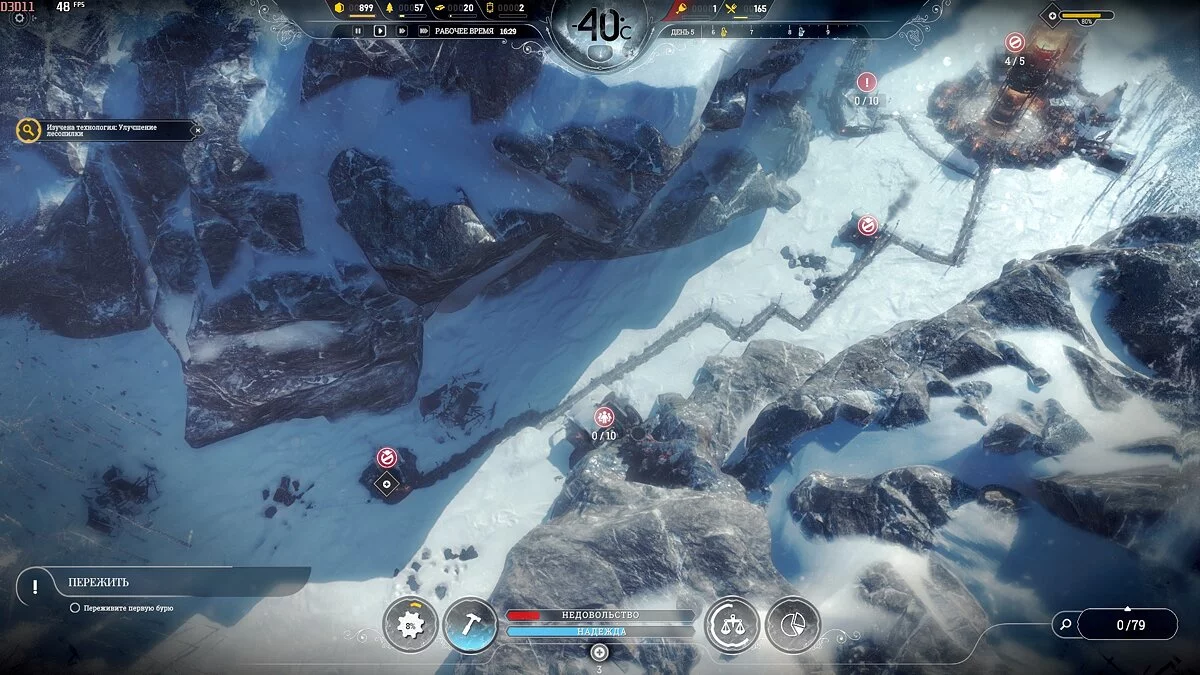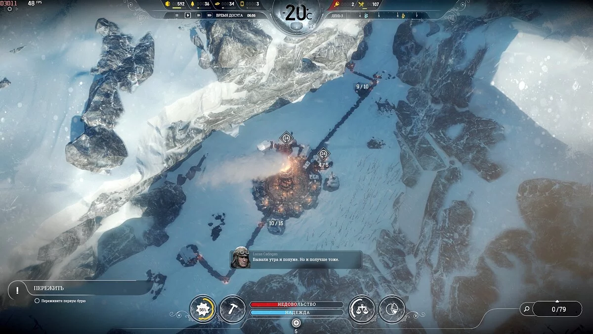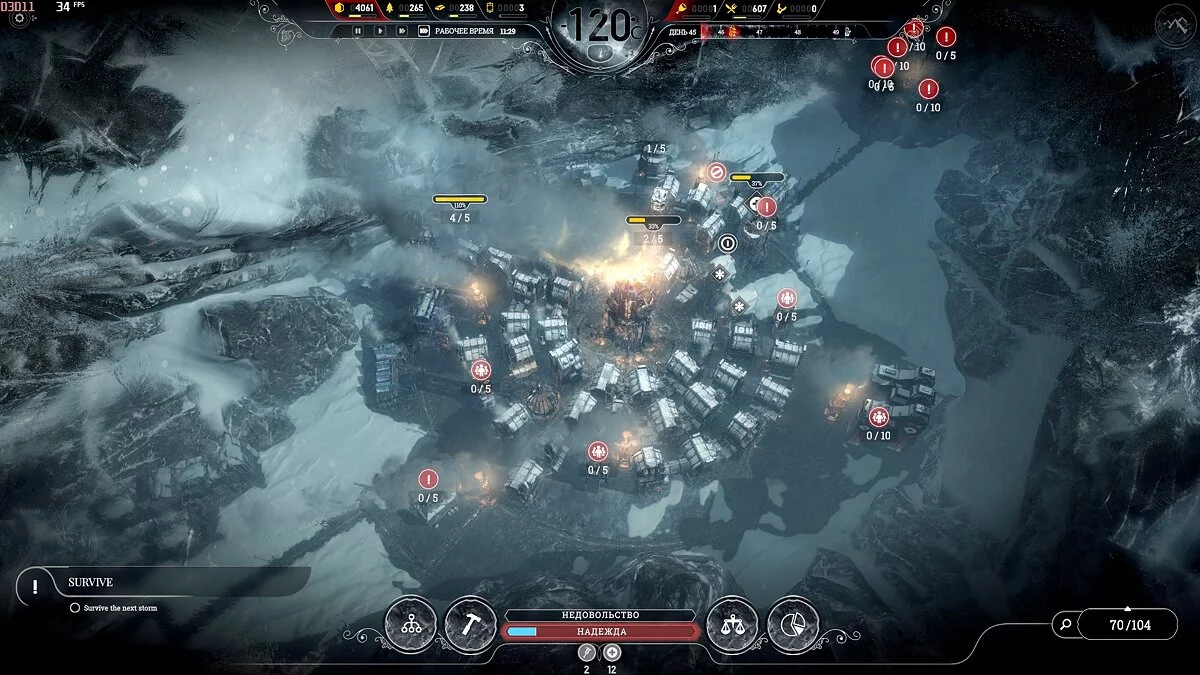 После темп сильно падает, поскольку приток беженцев уменьшается и половина карты, а то и больше, будет пустовать, так что остается только накапливать ресурсы. Бури на этой сложности идут один день 1 раз в 2 недели, понижают температуру на 2-3 пункта, обычная температура -40°С и она всегда восстанавливается.