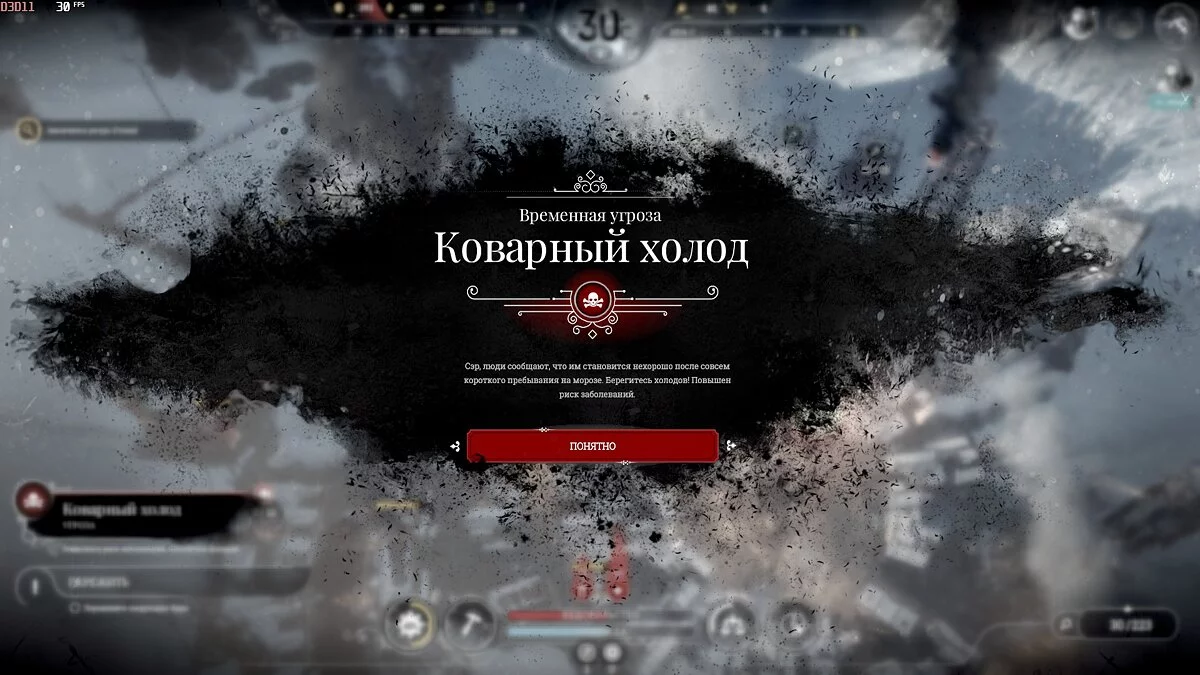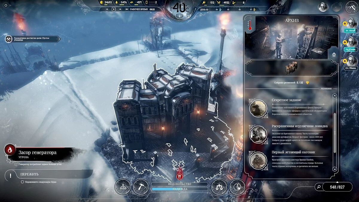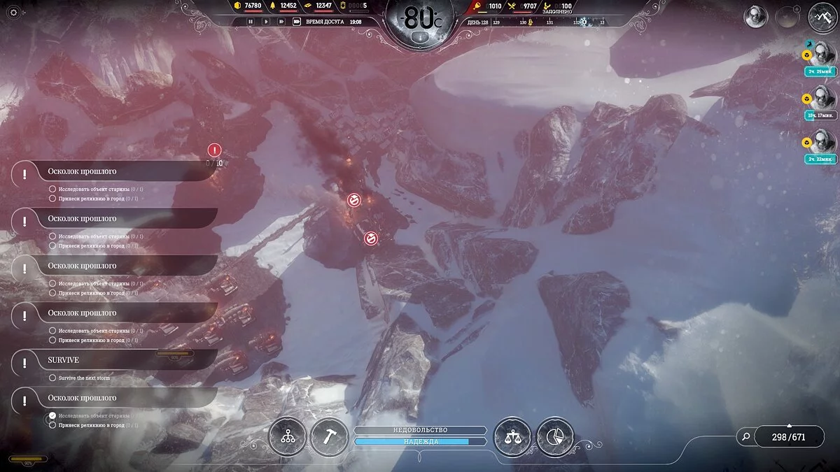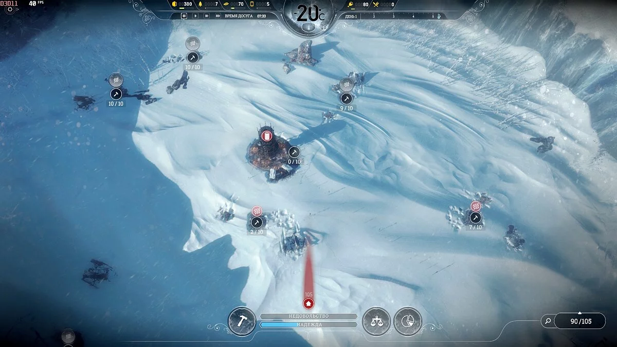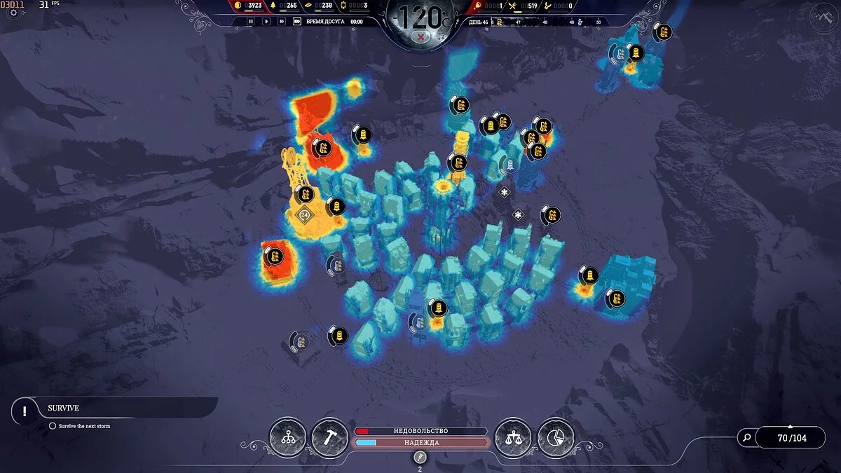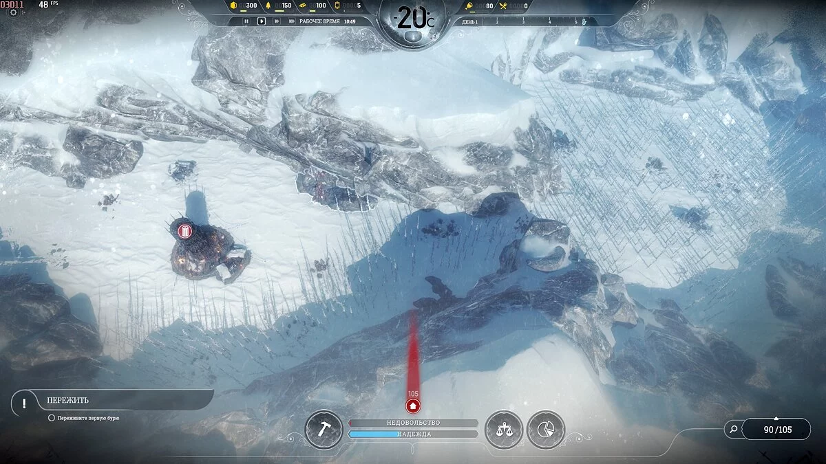 После темп сильно падает, поскольку приток беженцев уменьшается и половина карты, а то и больше, будет пустовать, так что остается только накапливать ресурсы. Бури на этой сложности идут один день 1 раз в 2 недели, понижают температуру на 2-3 пункта, обычная температура -40°С и она всегда восстанавливается.