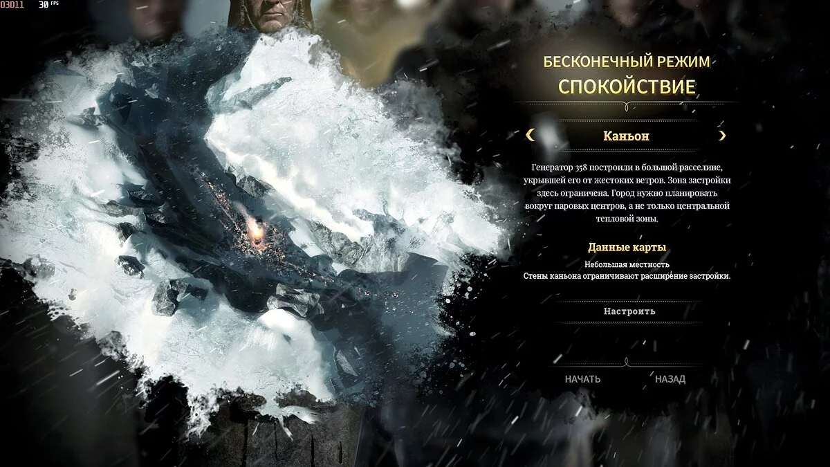 • Каньон — самая маленькая карта, в которой город игрока зажат между двумя ледяными стенами. Хорошо подходит для обкатки сложности «выносливость», все ресурсы в прямом и легком доступе.