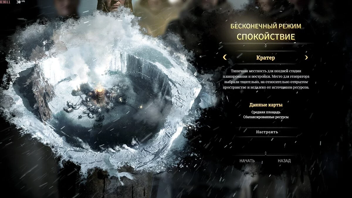 • Кратер — обычная карта Frostpunk, знакомая по сценарию «Новый дом». Также подходит для обкатки сложности «выносливость», места для людей больше, а ресурсы на расстоянии вытянутой руки.