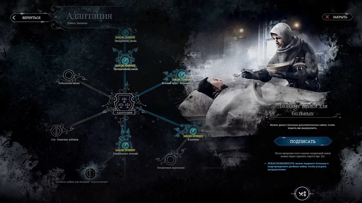 Вечером второго дня примите закон о продленной смене и «радикальное лечение», а также двойные пайки для больных. Чтобы население не бузило, можно принять закон о бойцовской арене и закон о пабе. Не стоит принимать закон о плохой еде, о пересадке конечностей, для законов порядка или веры также рано.