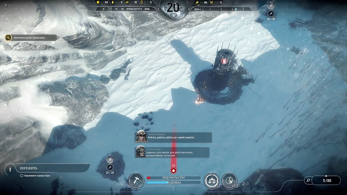 До 50-60 дня забудьте про экспансию — на это нет человеческих ресурсов. Также не стройте маяк, поскольку постоянные предупреждения о бурях сильно сбивают надежду населения и придется выполнять мини-квесты по её подъему.