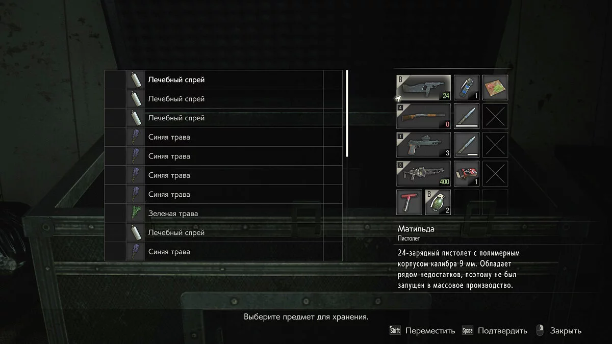 Количество предметов, которое может переносить ваш персонаж, строго ограничено. Особенно сильно это чувствуется в начале прохождения — и у Леона, и у Клэр есть всего по восемь ячеек. Половина из них перманентно будут заняты оружием, патронами и медицинскими средствами, поэтому свободного места для сбора других вещей крайне мало.