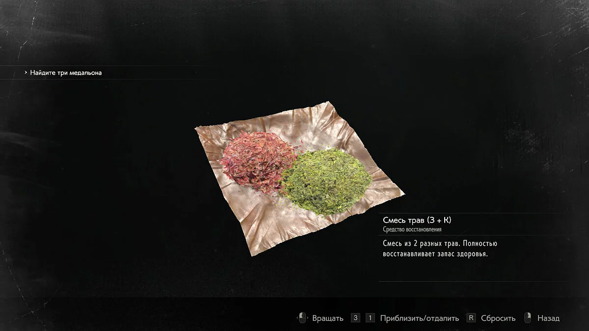 Как и в оригинальной игре, на уровнях Resident Evil 2 можно найти траву трех цветов — зеленую, красную и синюю. Зеленая трава восстанавливает здоровье, синяя снимает отравление, а красная сама по себе бесполезна, но зато может усилить действие любой другой травы. Чтобы эффективно использовать травы, их следует смешивать определенным образом.