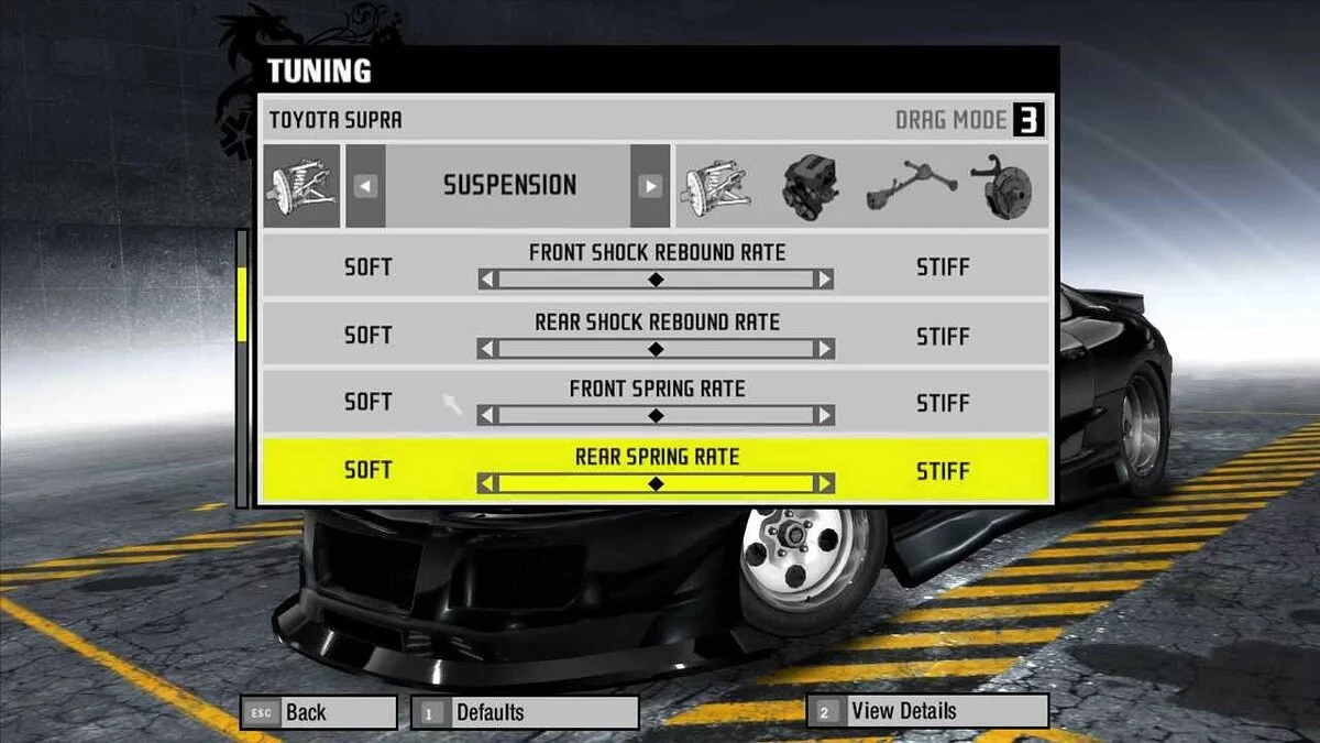 Поскольку Pro Street это больше симулятор, чем аркада, то появилась и более детальная настройка двигателя, коробки передач, тормозов и так далее, что было очень полезно при кастомизации машины под определённый тип гонок.