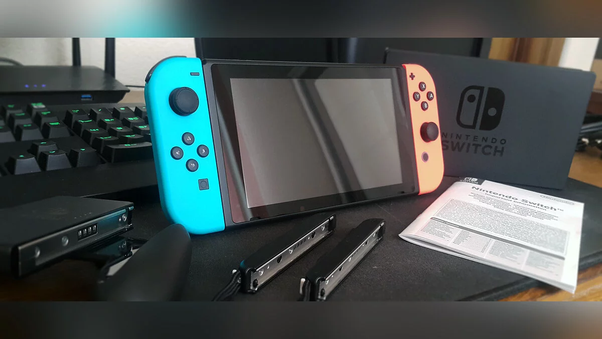 Разумеется, все самое интересное не снаружи, а внутри. Первое, что видит счастливый обладатель, это панель с экраном и два контроллера JoyCon. Они во второй ревизии «неоновые».