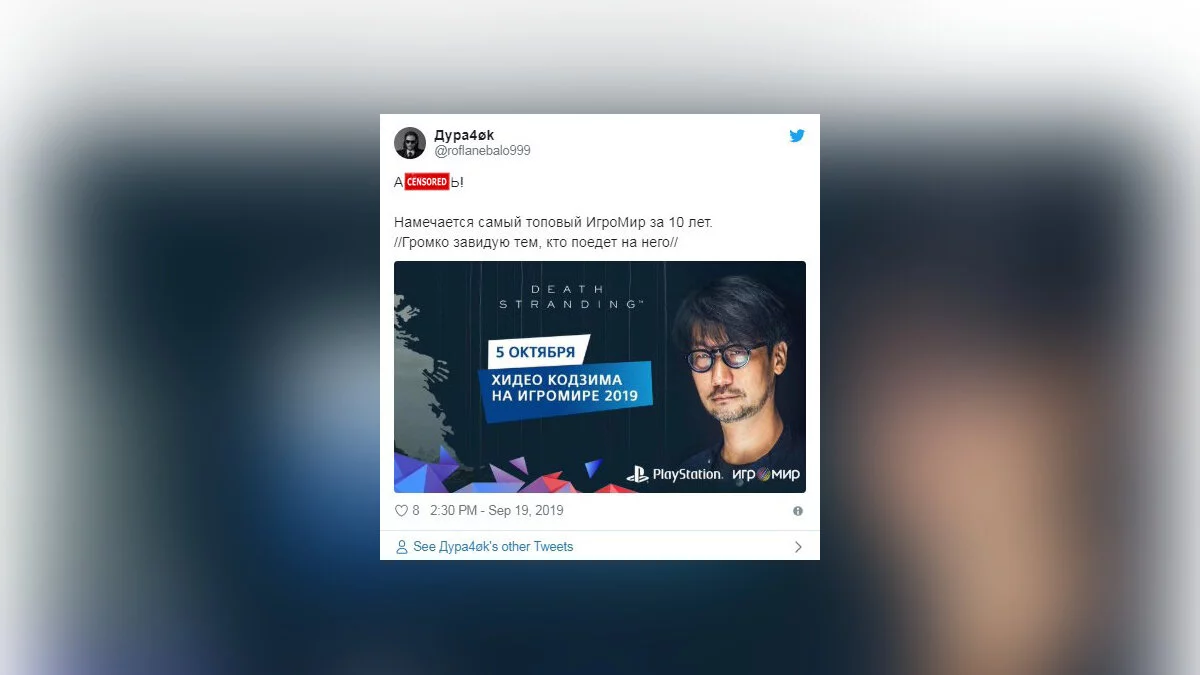 Кодзима посетит Москву! Гений представит Death Stranding на выставке «Игромир» 5 октября pic.twitter.com/VGeSXPPPBw