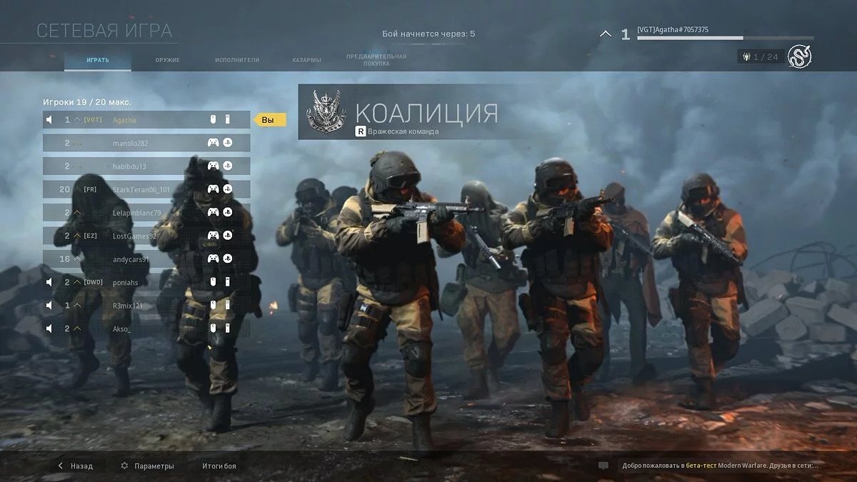 Бета-версия Call of Duty: Modern Warfare встретила нас аккуратным меню с одной единственной опцией — играть по сети. Дальше тоже все просто: можно выбрать один из трех доступных форматов игры и встать в очередь. Настройка персонажа и кастомизация оружия на старте недоступны, сначала нужно повысить уровень персонажа.