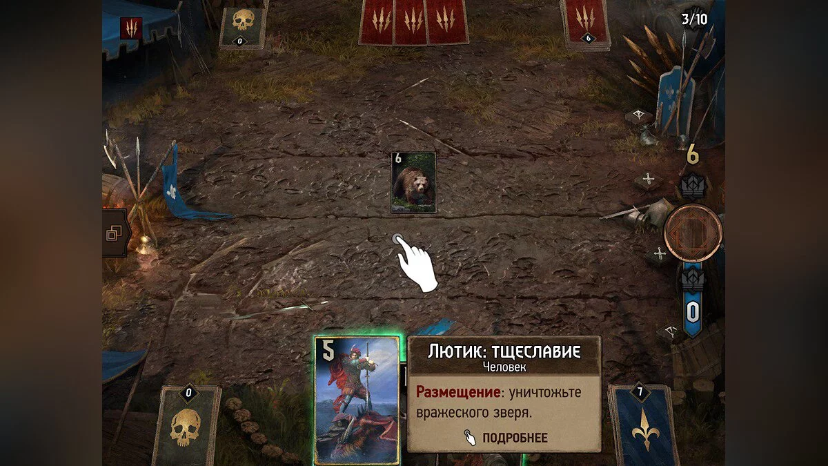 Например, грифон на восемь очков требует жертву. Если на линии её не окажется, карта самоуничтожится, а вы потеряете преимущество. Здоровья у героев нет, а их способности за матч можно использовать два раза. Например «Панцирь» накладывает щит на карты и три единицы к «здоровью».