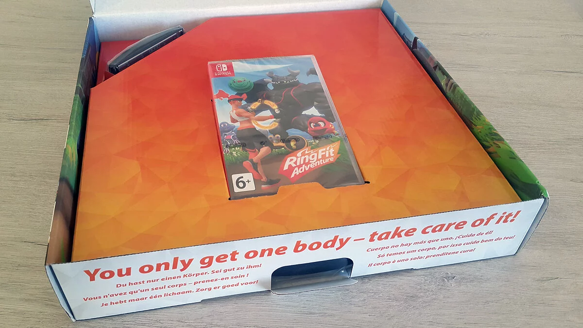 Ring Fit Adventure приехала в нашу редакцию в большой красивой коробке, которая оформлена в том же стиле, что и другие товары компании. На коробке есть довольно подробное описание аксессуара и его основных особенностей. Оно и понятно: при первом взгляде на этот «девайс» среднестатистический геймер может впасть в ступор. Издалека эта штука вообще напоминает детскую игрушку.