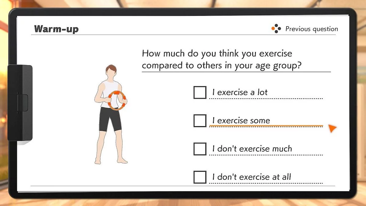 Последний этап подготовки будущего чемпиона — интерактивный опрос. Он нужен для того, чтобы определить примерный уровень подготовки пользователя. Отвечать следует честно, потому что уровни сложности в Ring Fit Adventure сильно отличаются.