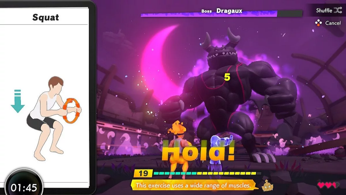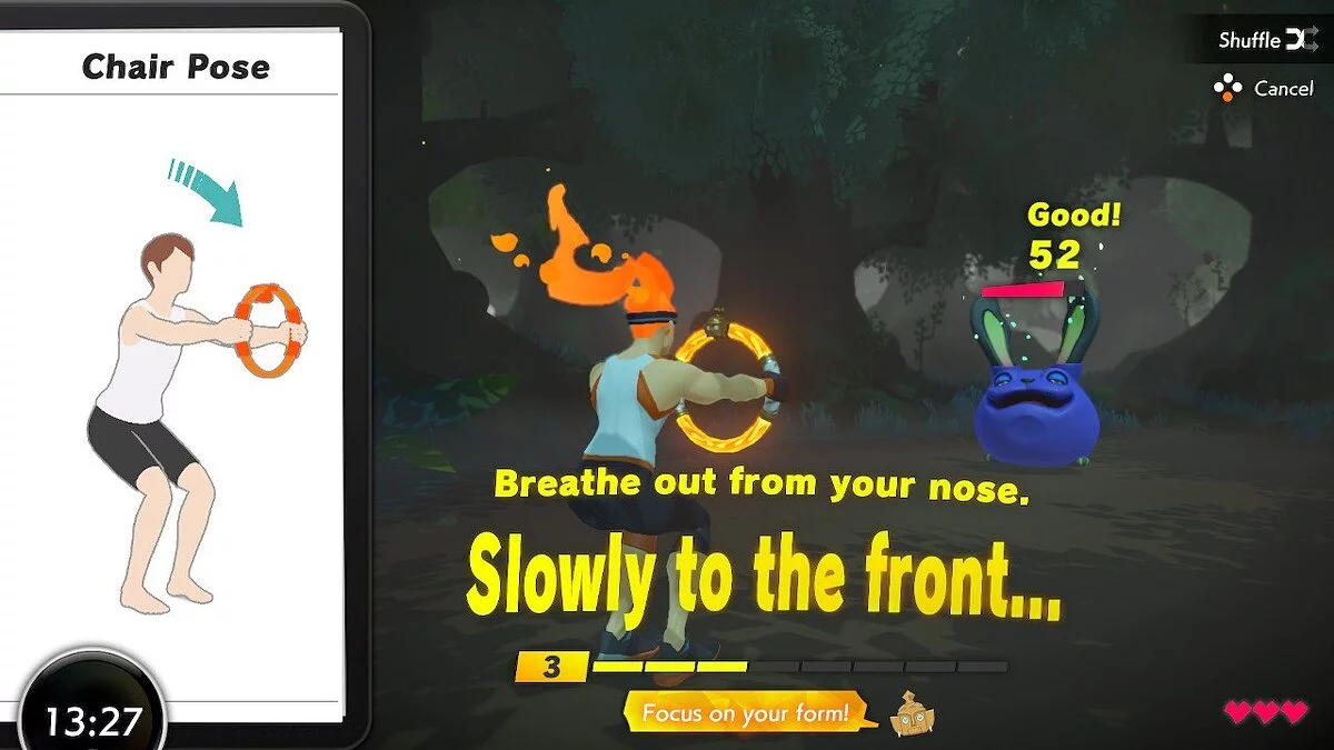 Разработчиков стоит похвалить и за то, что они предусмотрительно подготовили анимации для каждого движения. В углу экрана на всегда показано, как выполнять то или иное действие, поэтому игрок всегда понимает, что от него хотят. Вдобавок к этому игра поддерживает технологию вибрации HD Rumble, так что практически каждое действие сопровождается вполне ощутимым откликом. Ring Fit Adventure также умеет отслеживать качество исполнения. Чем лучше игрок делает то или иное упражнение, тем больше урона он наносит противнику. Все как в жизни: лучше медленнее, но качественней, чем быстро и кое-как.
