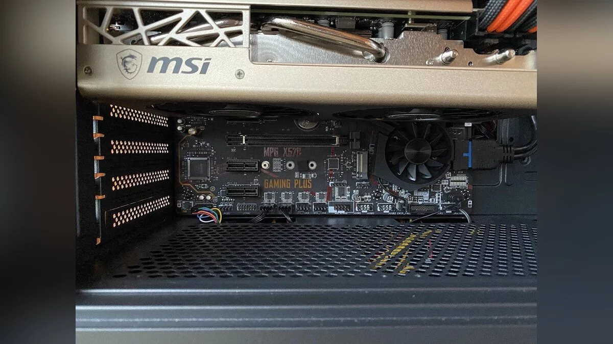 Кулер от Be Quiet, как и остальные комплектующие блока, были подключены к системной плате MSI MPG X570 GAMING PLUS на чипсете AMD X570. Да. У нас здесь максимально «красная» сборка. Из интересного стоит отметить отдельную физическую кнопку для обновления BIOS и возможность установить сразу две видеокарты.