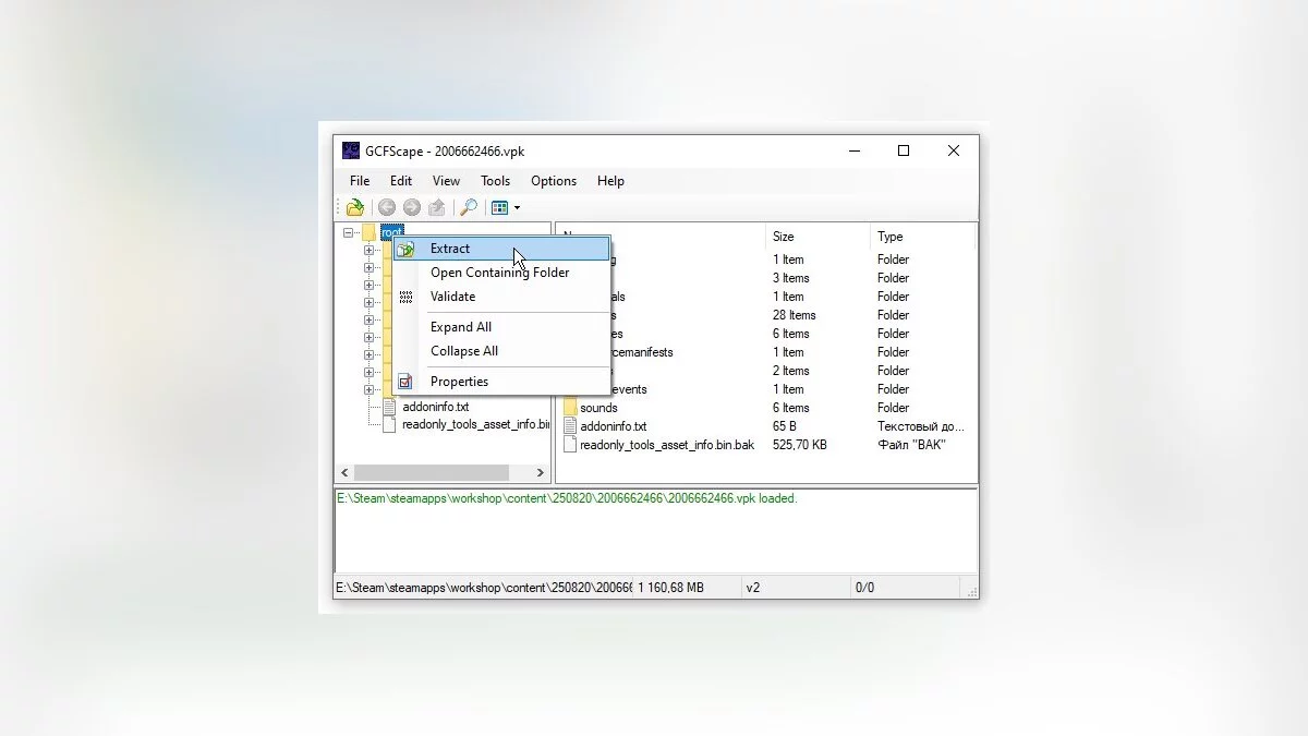 Поочередно откройте все три файла vpk в GCFScape и распакуйте их в указанную выше папку. Кликните правой кнопкой на папке root, нажмите extract, выберите путь. В результате содержимое трех файлов окажется в папке root. Перенесите его в папку hla. Можно просто вырезать и вставить.