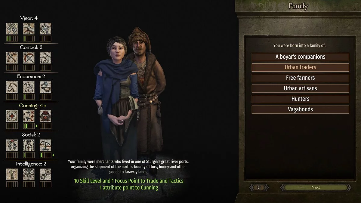 Закончив подбирать внешность своему будущему владельцу (или владелице) замков, земель и огромных армий или же простому разорителю караванов, тут уж как пожелаете, можно приступать к выбору прошлого: от происхождения до того, чем ваш герой увлекался в детстве. Разумеется, это все не просто так, а влияет на характеристики. И вот уже здесь нужно отдать должное разработчикам. Такой глубокой проработки персонажа вы вряд ли встретите где-то еще. Обычно все ограничивается выбором бэкграунда или каких-то определенных черт. Здесь же — полноценное досье. Первоначально со всеми этими параметрами разобраться сложно. Только проведя некоторое время в игре, вы поймете, что важно, а чем можно пожертвовать.