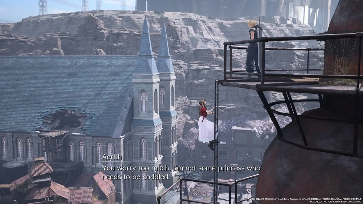 Разработчики как будто специально подталкивают к изучению локаций по сюжету. Из-за этого даже встречаются явные нестыковки в диалогах. К примеру, Баррет перед уходом из локации спрашивает Клауда, не хочет ли тот вернуться за материей, которую герои видели в начале уровня. Все бы хорошо, только эту самую материю мы уже подобрали пару минут назад. Впрочем, встречалась и обратная ситуация: в диалоге NPC упоминает ключ от кладбища, который нужен для выполнения квеста. И здесь Айрис уже вполне логично отмечает, что вот мол как хорошо, что мы его уже нашли ранее.