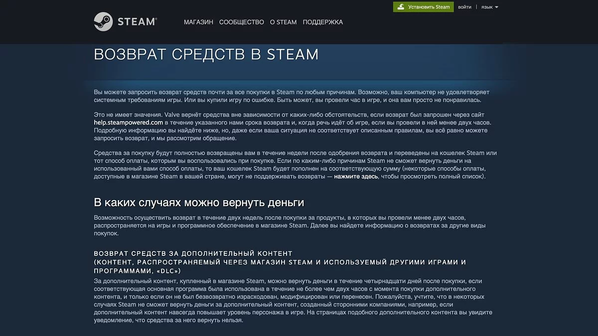 Но самый дружелюбный магазин в этом смысле — GOG, который позволяет вернуть за игру деньги в течение 30 дней после покупки, даже если вы её уже запускали. При этом в правилах не уточняется ограничение на количество проведенного в игре времени, так что в теории её за это время можно даже пройти.
