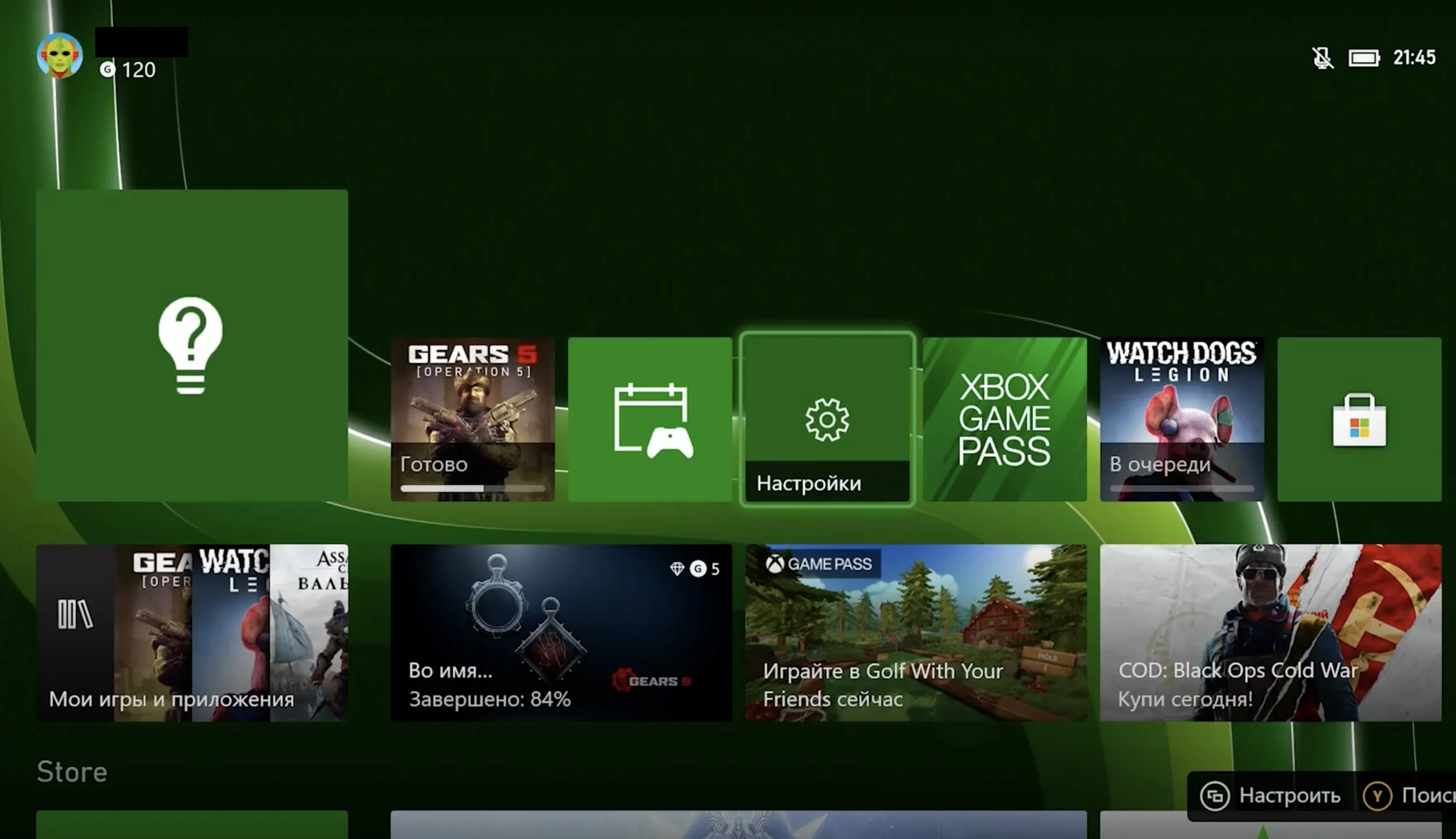 Запускаем. Меню здесь такое же, как у Series X. И оно смотрится куда симпатичнее, чем признанный «совершенным» тоскливый интерфейс PS5. На зелёном фоне переливается какая-то загогулина, функциональные плитки зовут к приключениям… Что ж, вперёд!