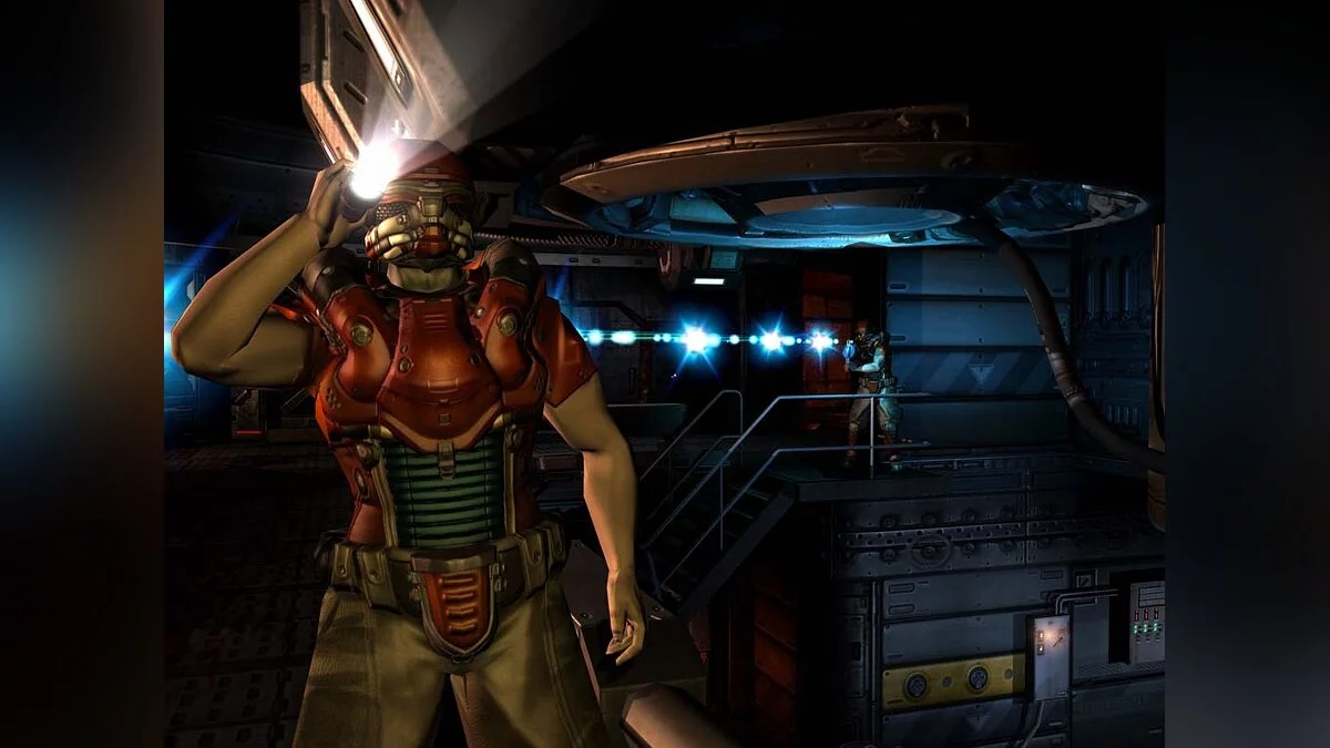 А теперь по порядку. id Software за весь период своего существования, всегда работали по стандартной схеме: сначала новый движок от Кармака (John Carmack), а потом уже геймдизайн. Так уж вышло, что id Tech 4 не был рассчитан на толпы врагов, а главными его достоинствами оказались попиксельное освещение и бамп маппинг. Для демонстрации всех этих красот, разработчикам пришлось отодвинуть мясной экшен на второй план. На первом месте теперь были тёмные углы, чувство изолированности, гнетущая атмосфера и киношные скримеры. А фонарик служил в первую очередь для демонстрации современной технологии отображения теней. Ну и создавал дополнительное напряжение.