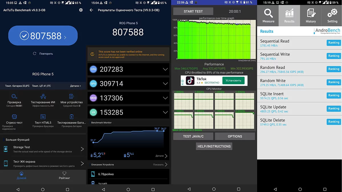 Без синтетики в тестах смартфонов не обойтись. Мы проверили производительность ROG Phone 5 в AnTuTu, Androbench и CPU Throttling Test. Результаты — на скриншотах. Все тесты проводились в режиме «Х».