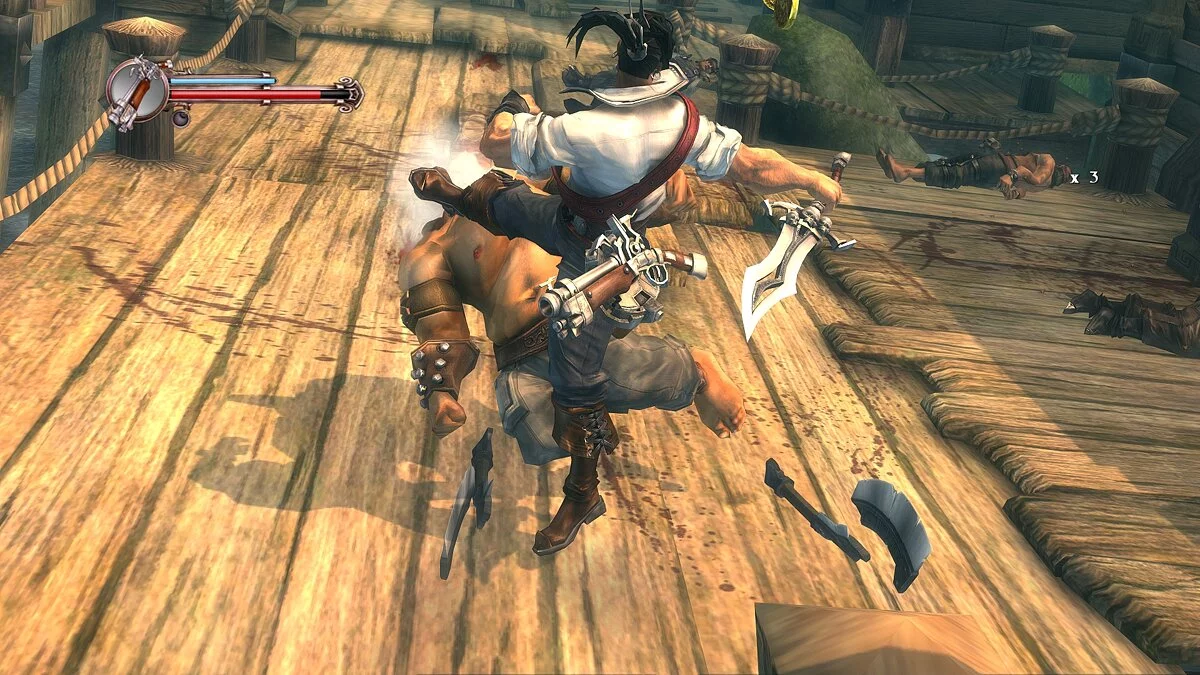 Впрочем, мало кто решит проходить «Приключения капитана Блада» ради сюжета: во главе угла здесь геймплей. Начнём с того, что эта игра — кровавый слэшер, в котором нужно без устали рубить на кусочки толпы врагов. По умолчанию Блад вооружён могучей саблей, дальнобойным пистолетом и мощной бомбой — с этим набором нам и предстоит влетать в толпу и творить эффектные комбо. Когда враг будет достаточно изранен, можно провернуть жестокое добивание, которое отправит оппонента на тот свет.