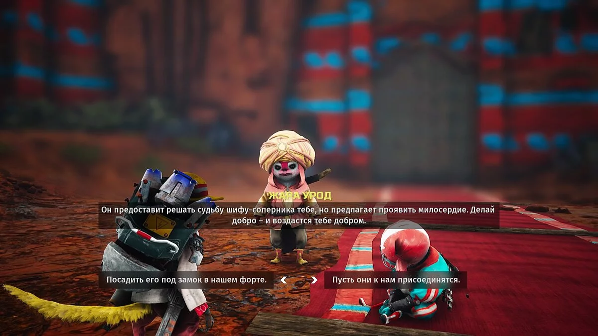 А ещё сюжет Biomutant концентрируется на борьбе добра и зла. В целом, в этом нет ничего плохого, но игровая вселенная чересчур сильно поделена на чёрное и белое. К примеру, в самом начале игры герою нужно выбрать племя, которое он будет поддерживать: первое — ангельские святоши, которые желают всем счастья и процветания, а вторые — злобные негодяи, стремящиеся поскорее погрузить мир в пучину хаоса и перебить слабаков. В самом деле, кого же выбрать?