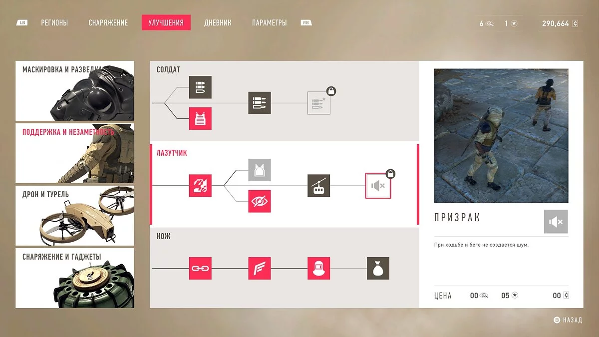 Хватает и других крутых примочек. У героя есть дрон, который умеет отмечать цели и взламывать электронику, а после прокачки может даже усыплять противников. Также в наличии небольшая снайперская турель, которая по команде расстреливает отмеченных врагов и также подлежит улучшению. Взять на задание можно и стандартное вооружение вроде автомата, пистолета с глушителем, гранат, мин, бомб и так далее.