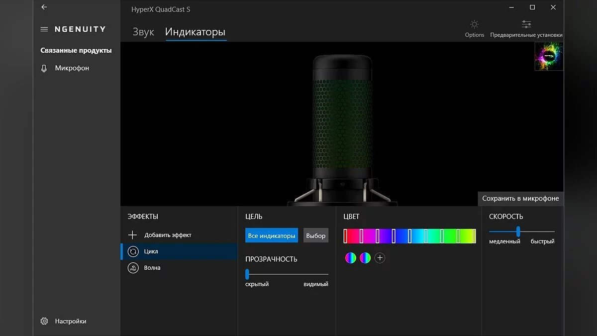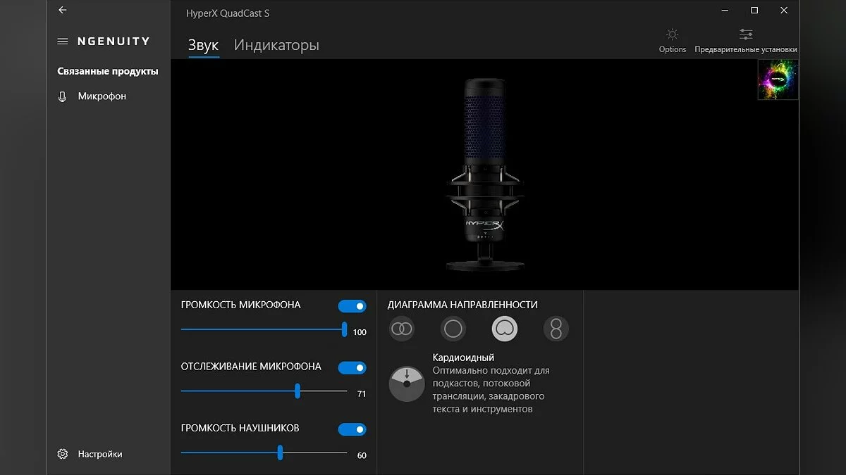 В программе HyperX NGENUITY минимум настроек звука. Доступны только регулировки громкости микрофона, отслеживания и наушников. В первую очередь ПО следует устанавливать для контроля подсветки. Здесь можно как выбрать предустановленные режимы, так и задать свои. Выбранные настройки можно сохранить в памяти устройства.