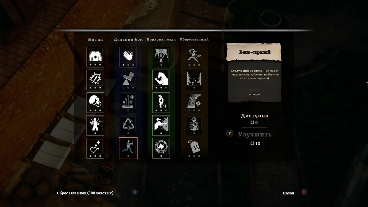 В дальнем бою Гай использует арбалет. По началу он медленно перезаряжается — приходится делать один выстрел и доставать меч. Однако стоит его прокачать, как Гай станет машиной смерти, которая быстро меняет стрелы даже на бегу.