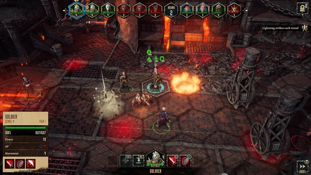 Добавьте к этому эффекты на поле боя. Временами в клетках появляются особые точки: некоторые из них лечат, если пройти сквозь них, другие наоборот наносят урон или накладывают негативные эффекты. Есть локации, по которым и вовсе регулярно лупят молнии.