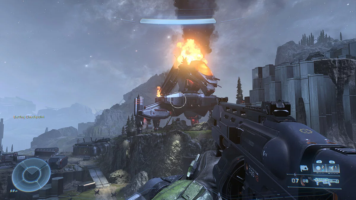 Фактически у Infinite есть два состояния. Первое — это открытый мир, усеянный ёлками и военными объектами. Под конец ещё дают поглядеть на кладбище кораблей. А второе — это стерильные металлические коридоры, по которым бегали ещё западные геймеры-олды 20 лет назад.