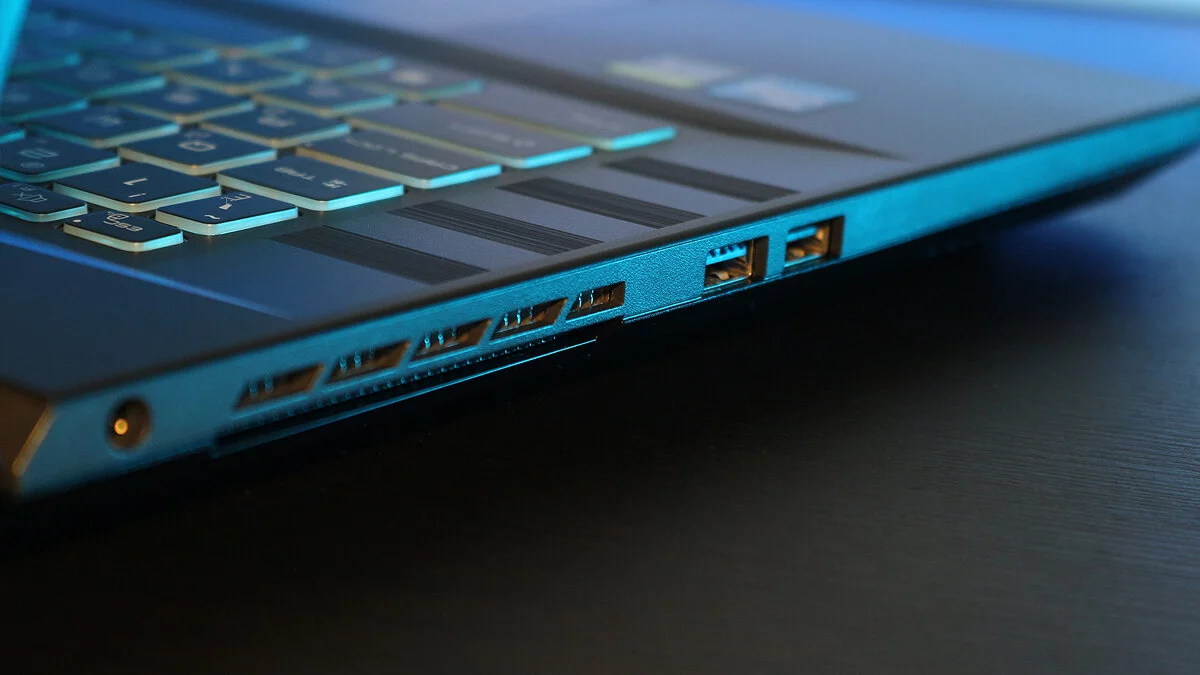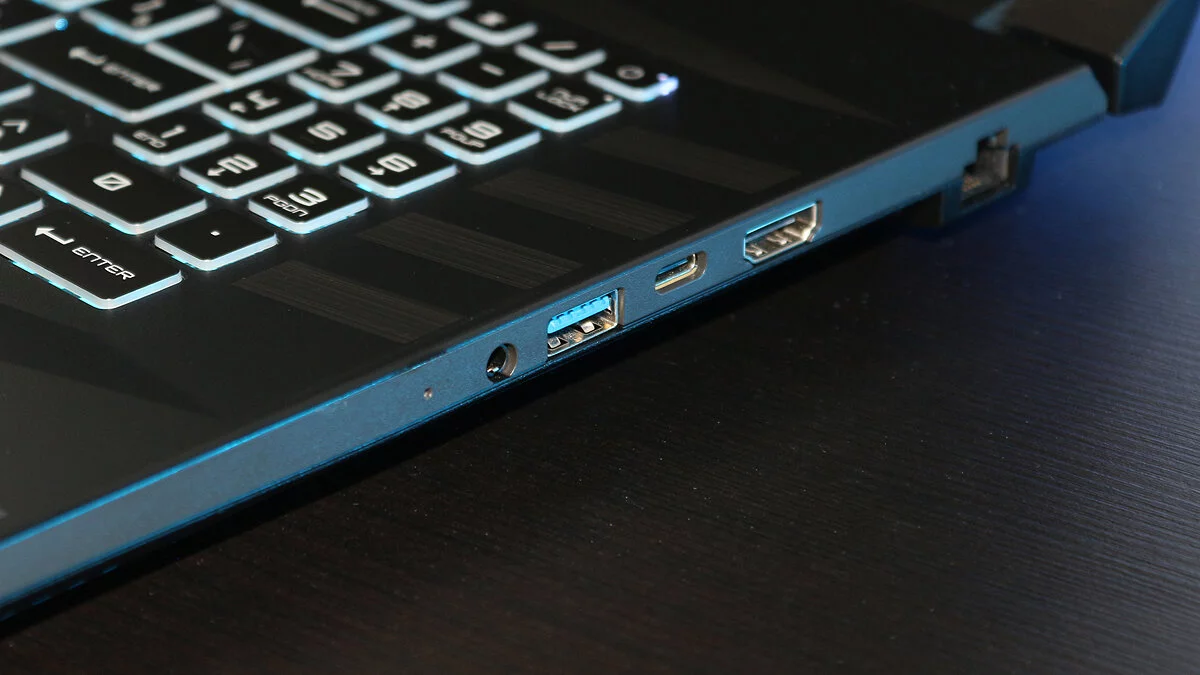 В MSI Pulse GL76 порты расположены только слева и справа. На левую сторону помещены два порта USB и питание. На правой стороне находятся Type-C USB3.2 Gen1, один порт USB, HDMI, RJ-45, универсальный аудиоразъем (мини-джек 3,5 мм) и индикатор работы.