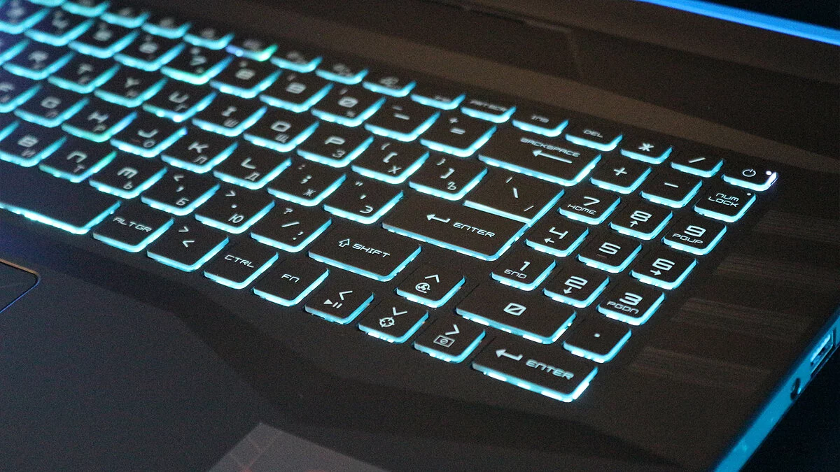Клавиатура установлена большая. Она слегка утоплена в корпус и может похвастаться полноценной подсветкой, которую легко настроить под себя в фирменном приложении MSI Center. Играть на почти полноразмерной клавиатуре вполне комфортно, но к небольшому ходу клавиш и средней отзывчивости придётся привыкнуть.