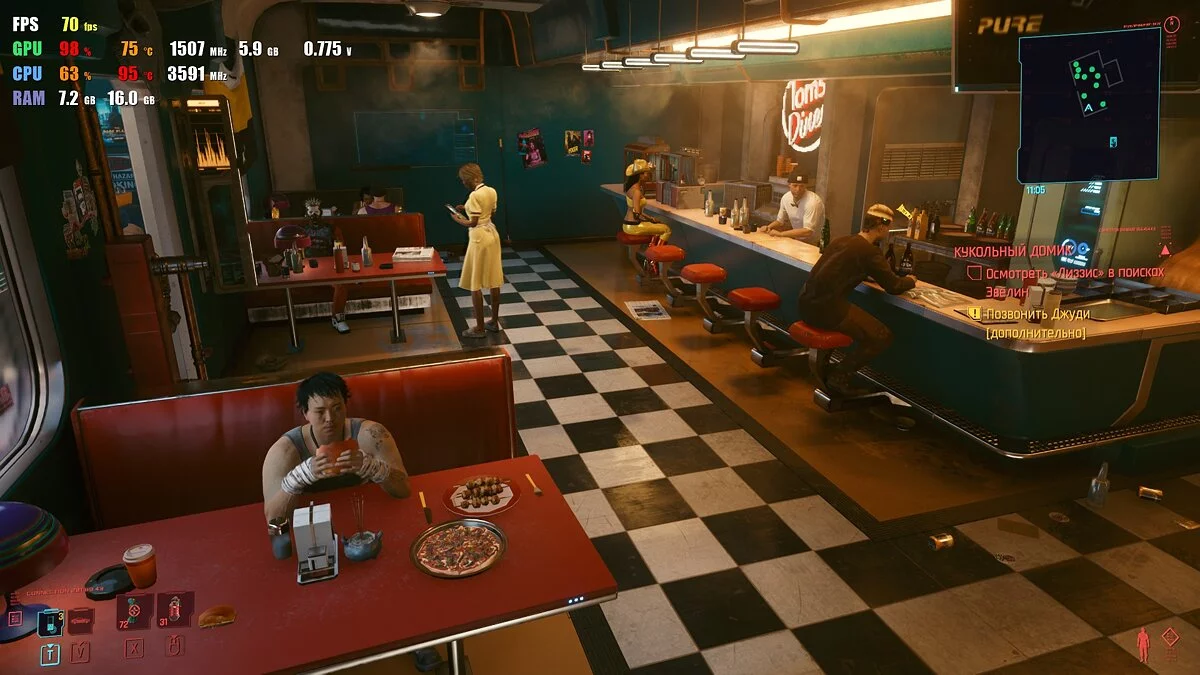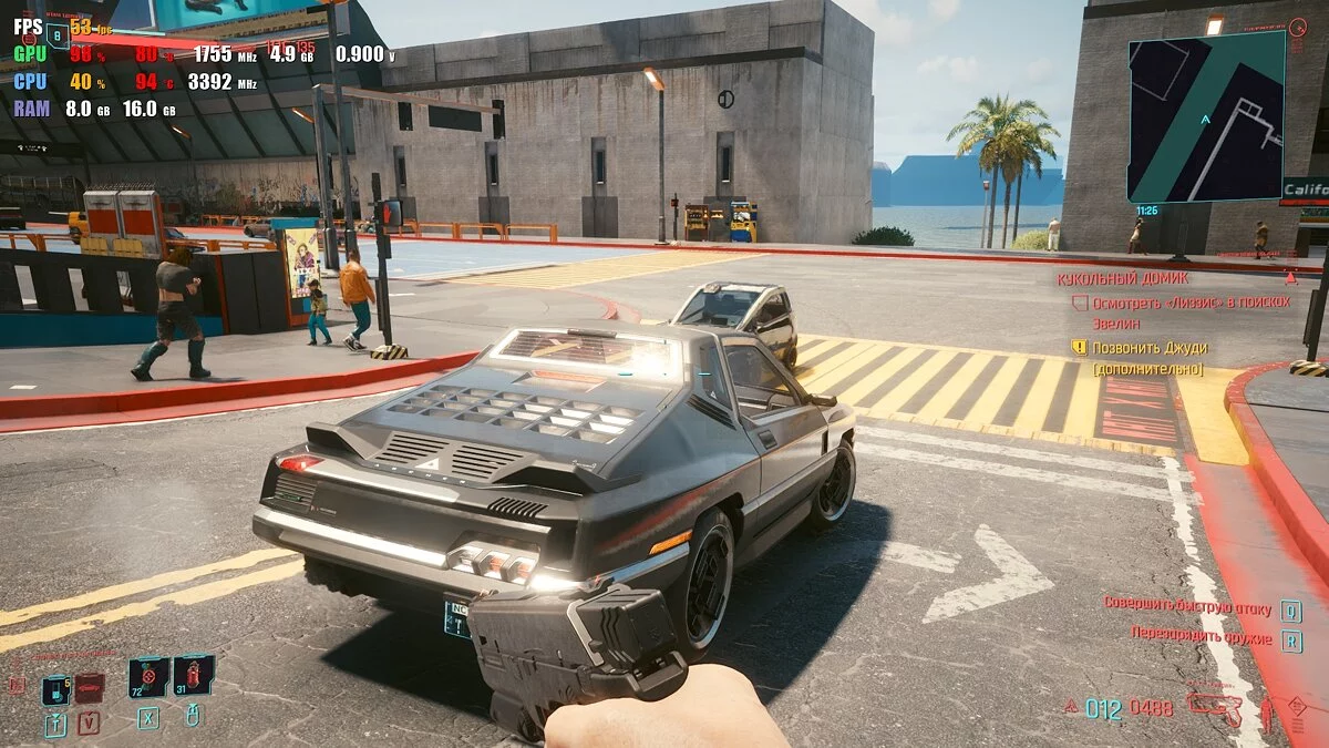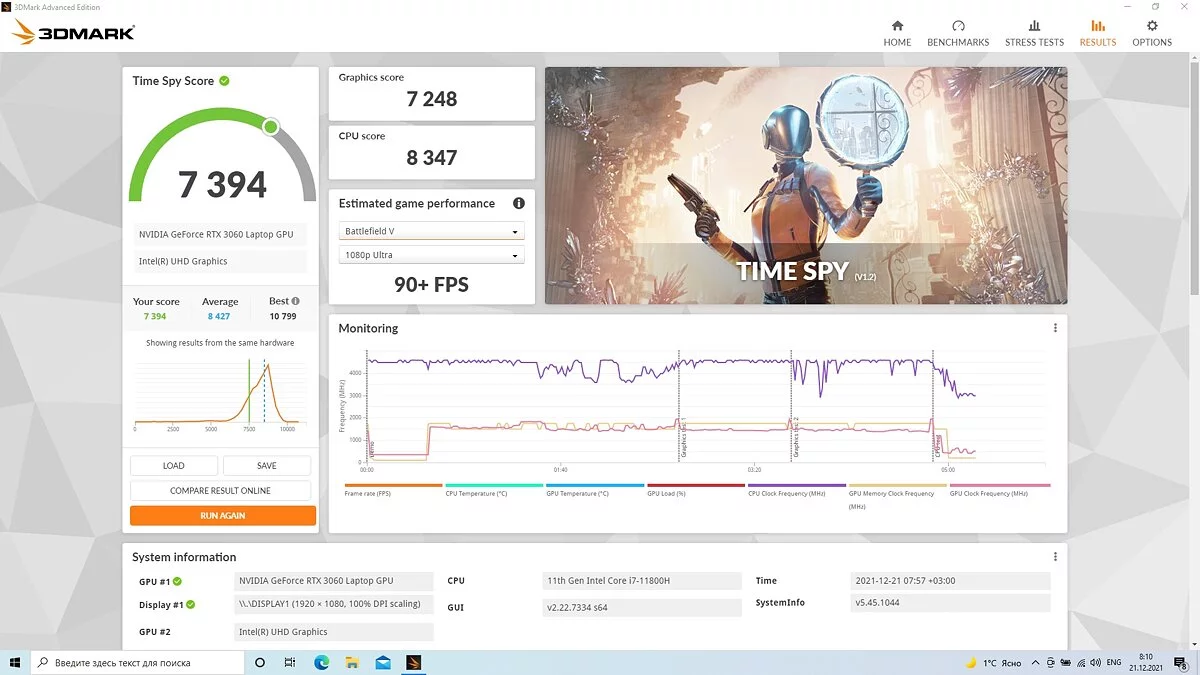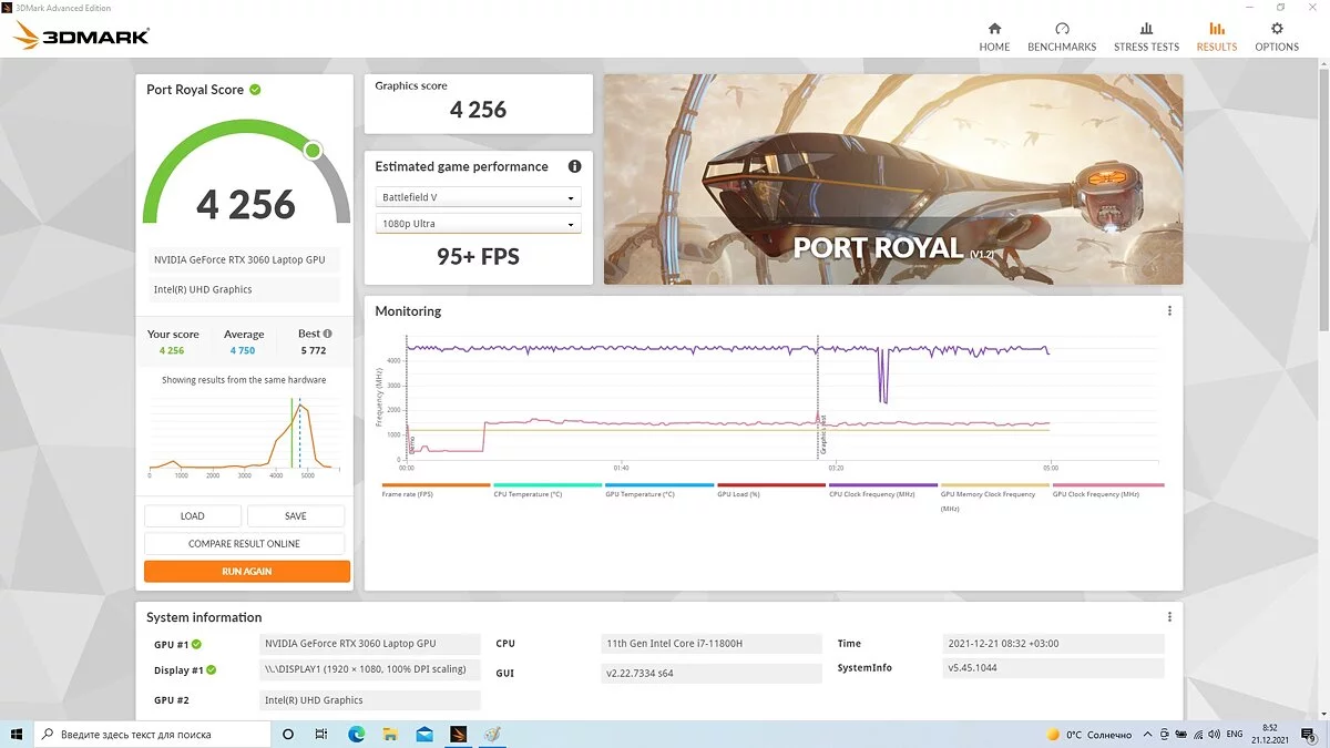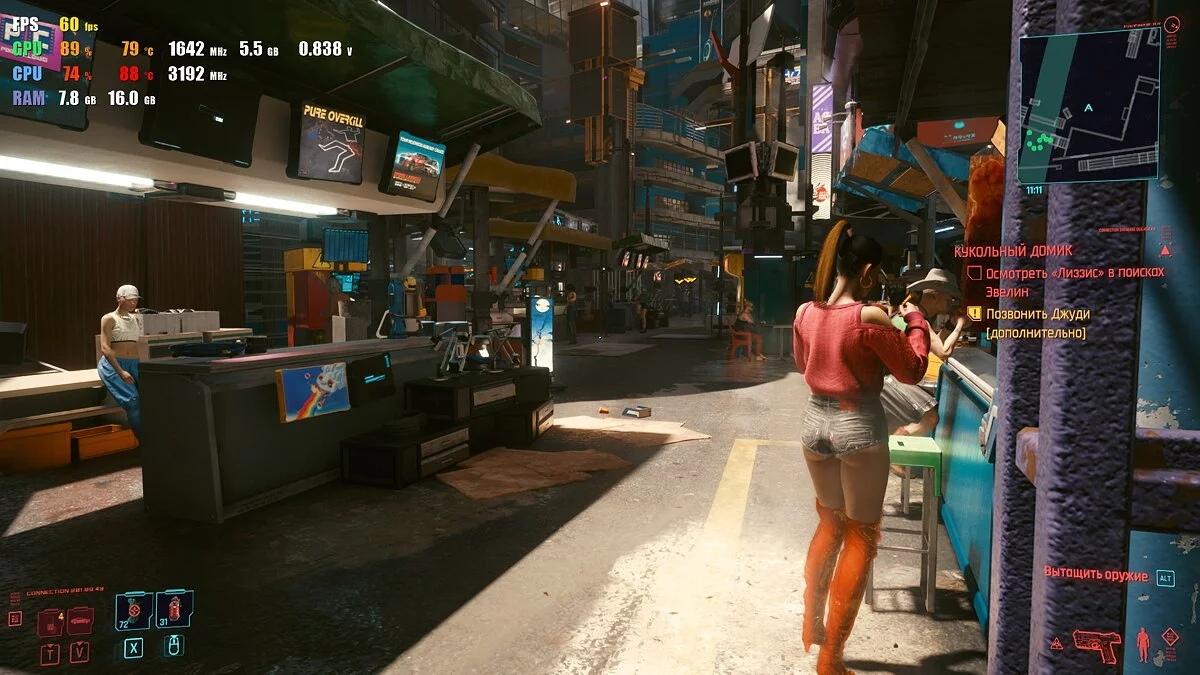 Cyberpunk 2077. Симуляция масштабного футуристического города заставляет поднапрячься не только видеокарту, но и процессор. Intel Core i7-11800H этот тест прошёл, а бутылочным горлышком всё-таки стала NVIDIA GeForce RTX 3060 для ноутбуков. FPS в Cyberpunk 2077 никак нельзя назвать стабильным, но и серьёзных падений игра не показала. Средняя частота кадров составила около 60.