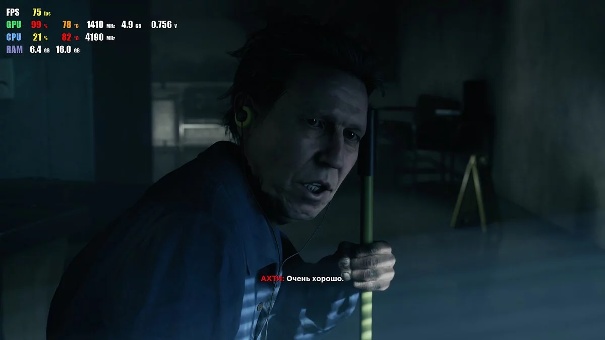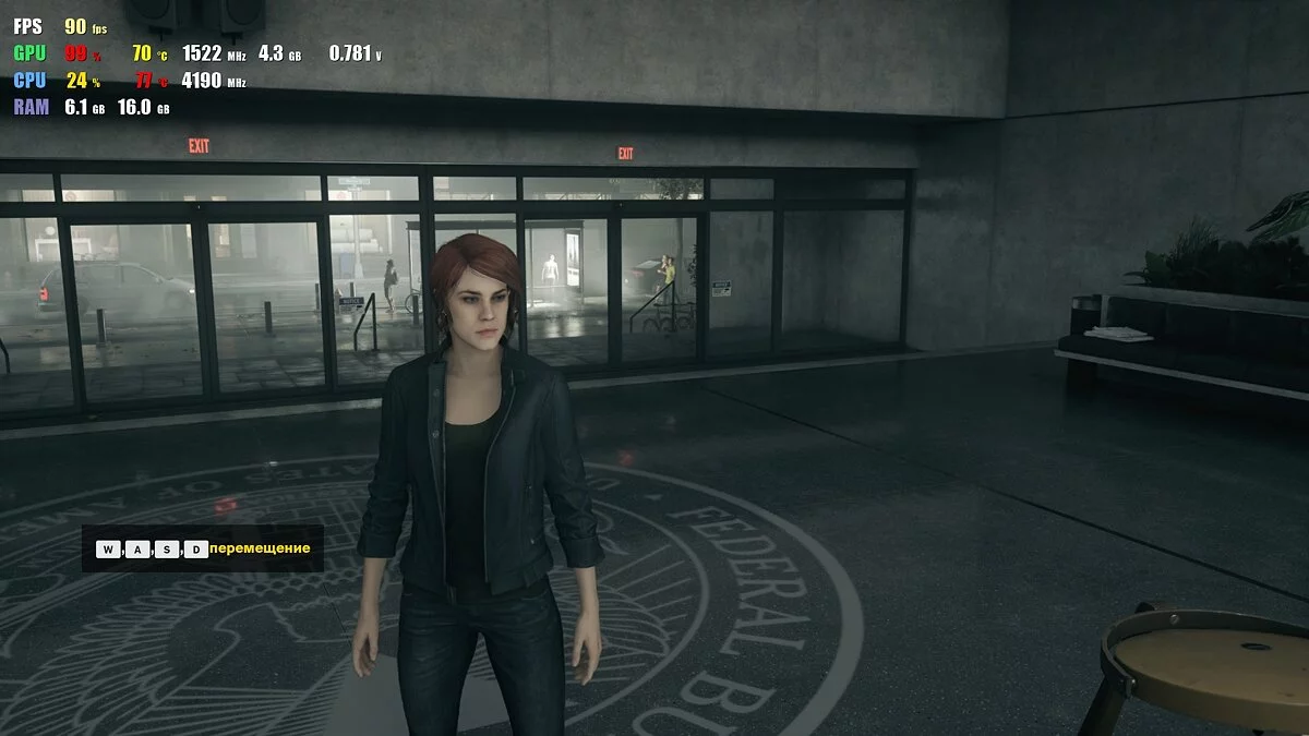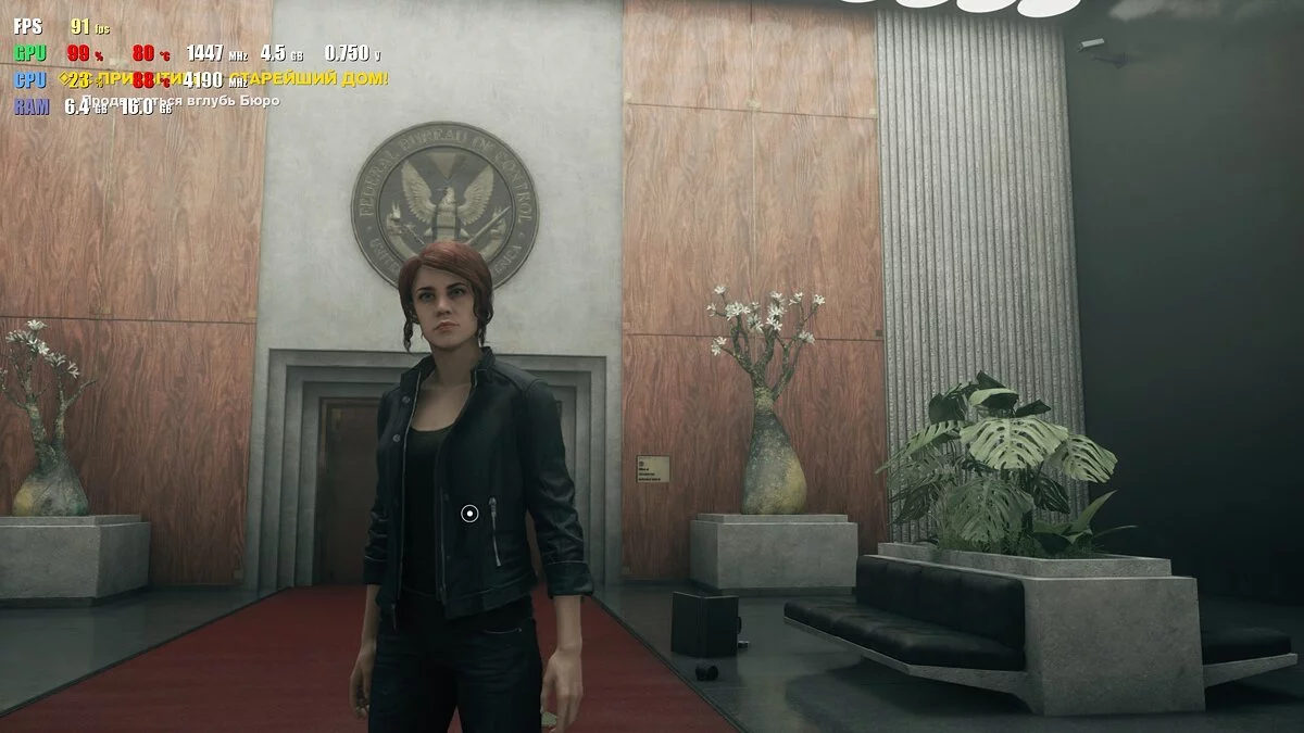 Control. Мы использовали DLSS в разрешении рендеринга 1280х720 пикселей, остальные настройки все были выставлены на максимум. В сюжетных сценах FPS опускался до 73, в геймплее оставался в районе 80-85.