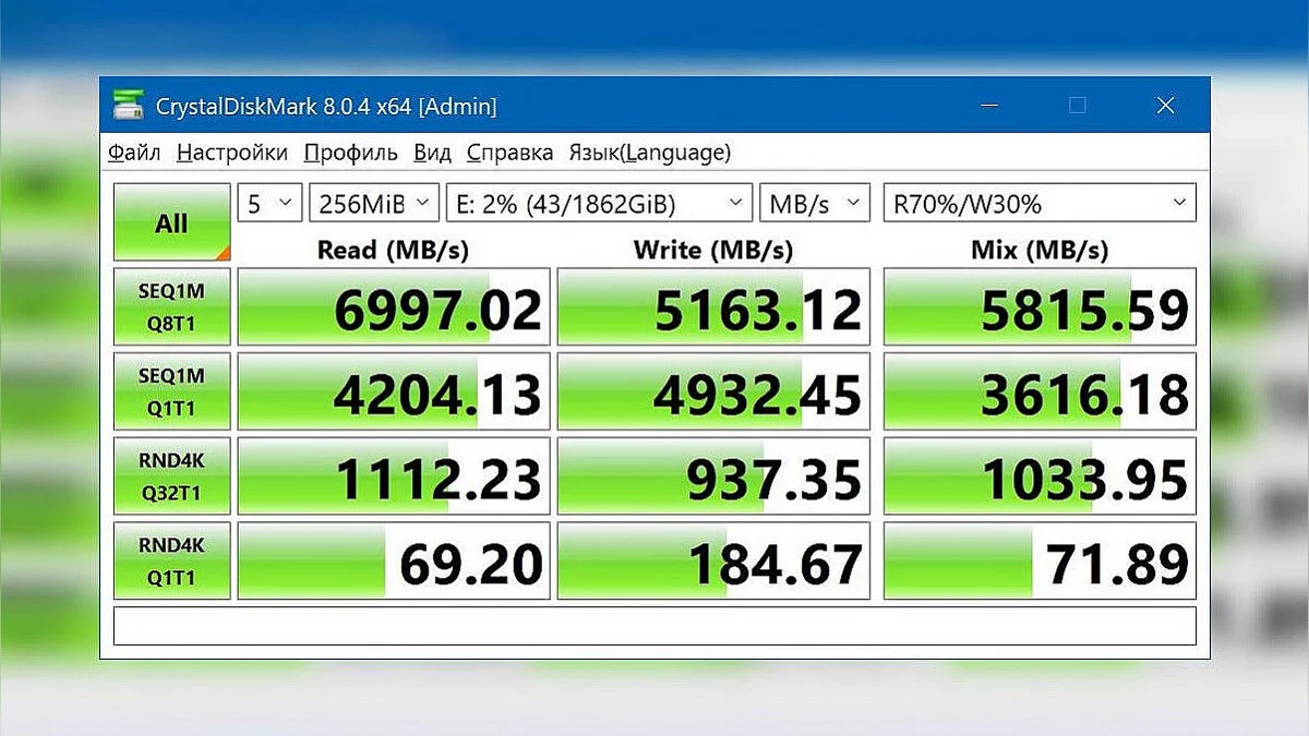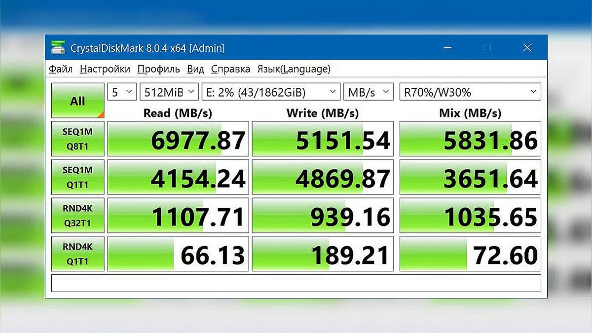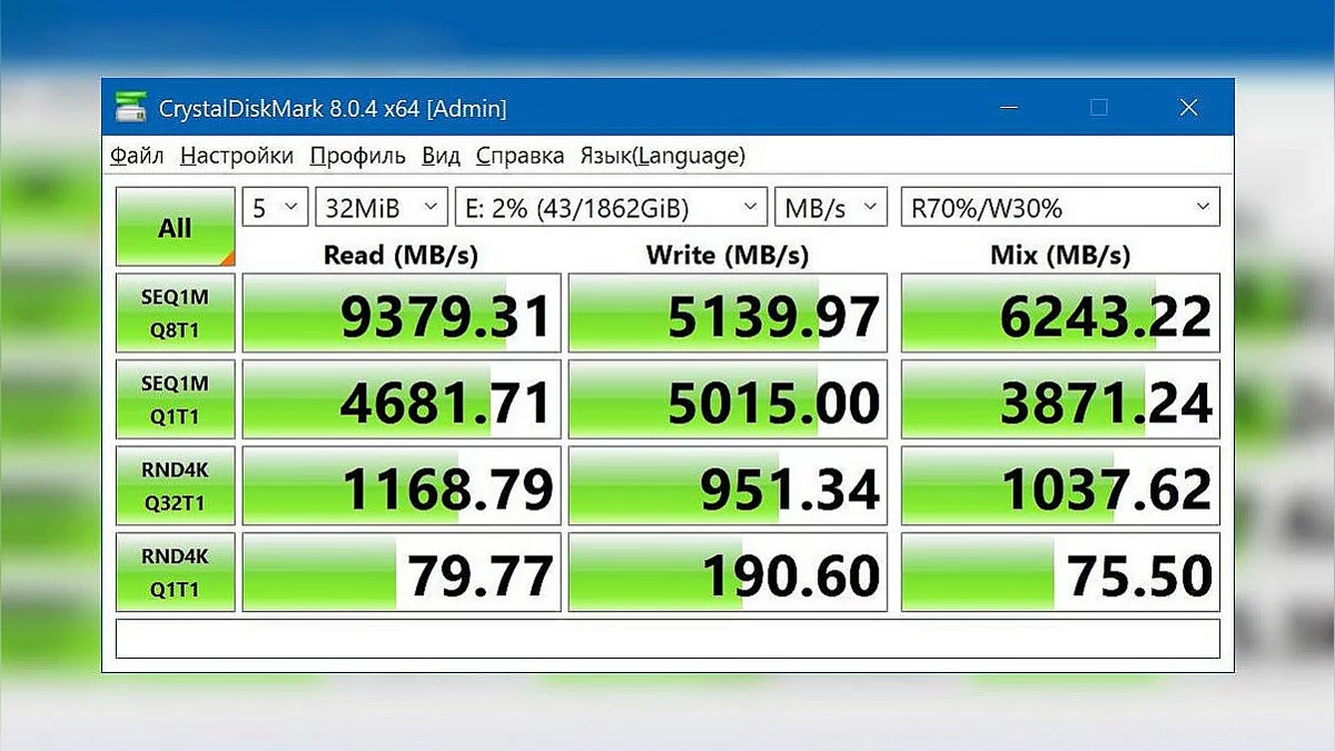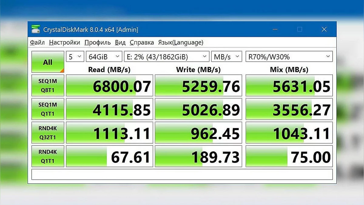А теперь, пришла пора полностью раскрыть потенциал накопителя и выжать из него максимум скорости, подключив уже к порту M.2, работающему по PCIe 4. В Crystal Disk Mark накопитель выдал уже от абсолютно фантастические значения в районе 9400 Мб/с на чтение, правда, для файлов маленького размера, а для больших уже значения, близкие к официально заявленным 7000 Мб/с. На запись — стабильно до 5000-5200 Мб/с. И тут производитель нас не обманул.