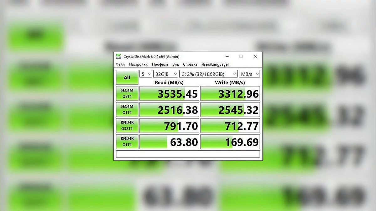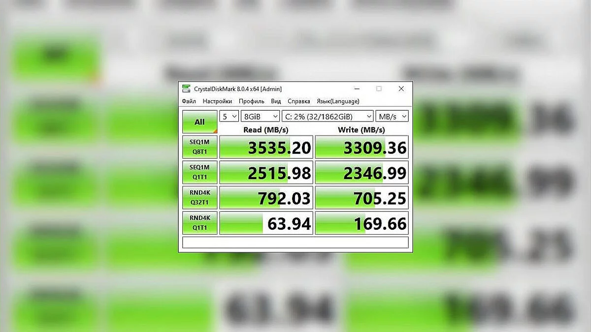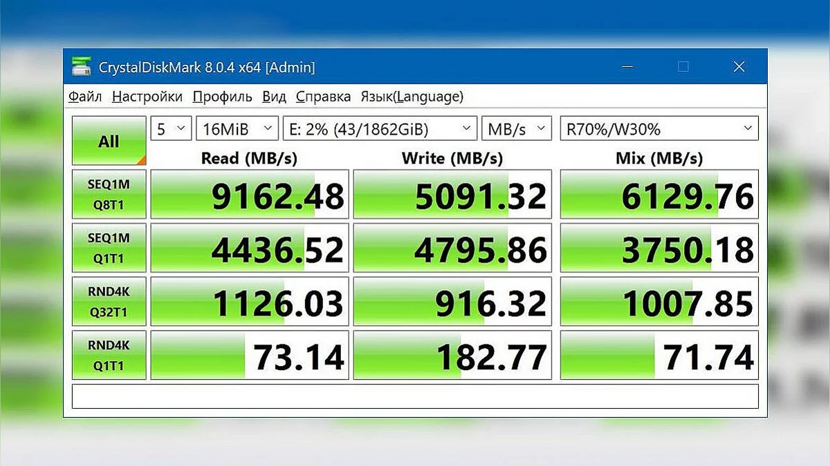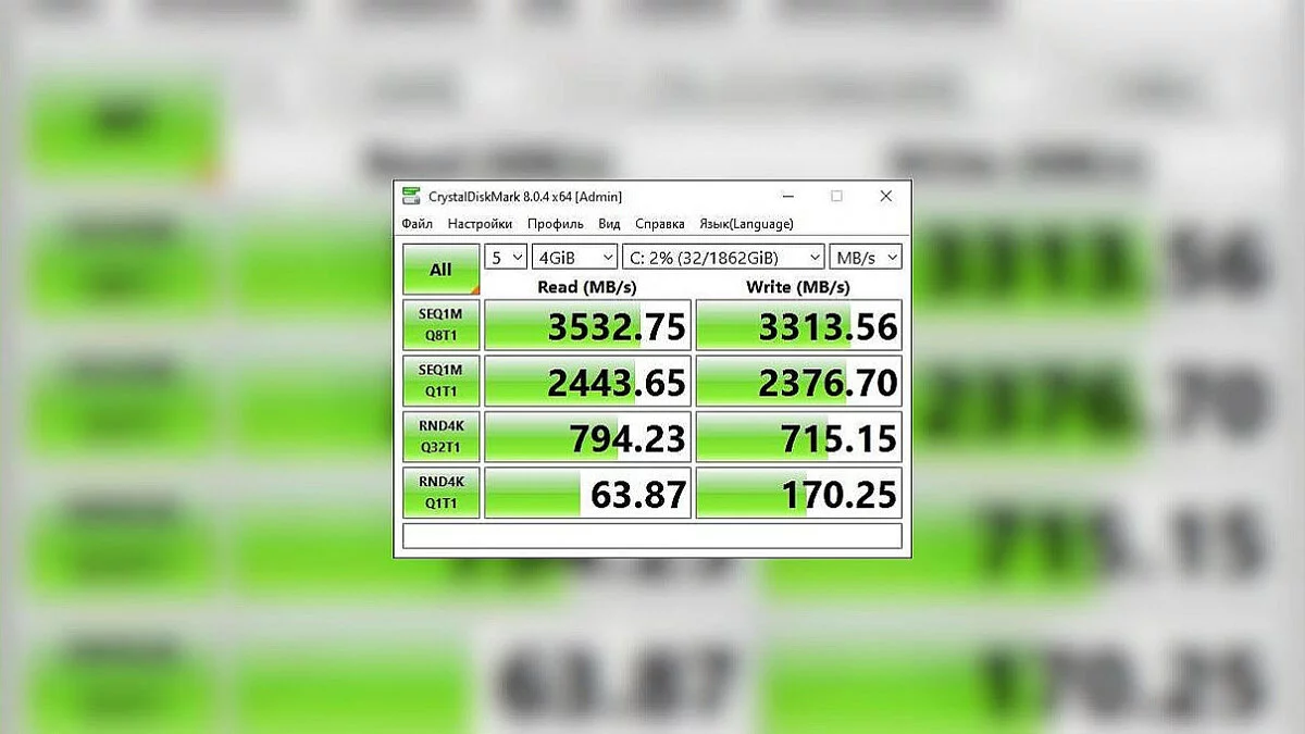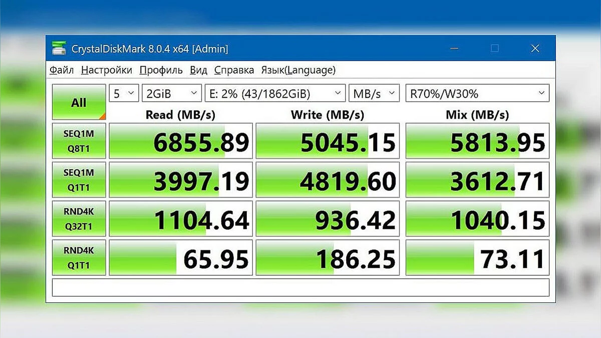А теперь, пришла пора полностью раскрыть потенциал накопителя и выжать из него максимум скорости, подключив уже к порту M.2, работающему по PCIe 4. В Crystal Disk Mark накопитель выдал уже от абсолютно фантастические значения в районе 9400 Мб/с на чтение, правда, для файлов маленького размера, а для больших уже значения, близкие к официально заявленным 7000 Мб/с. На запись — стабильно до 5000-5200 Мб/с. И тут производитель нас не обманул.