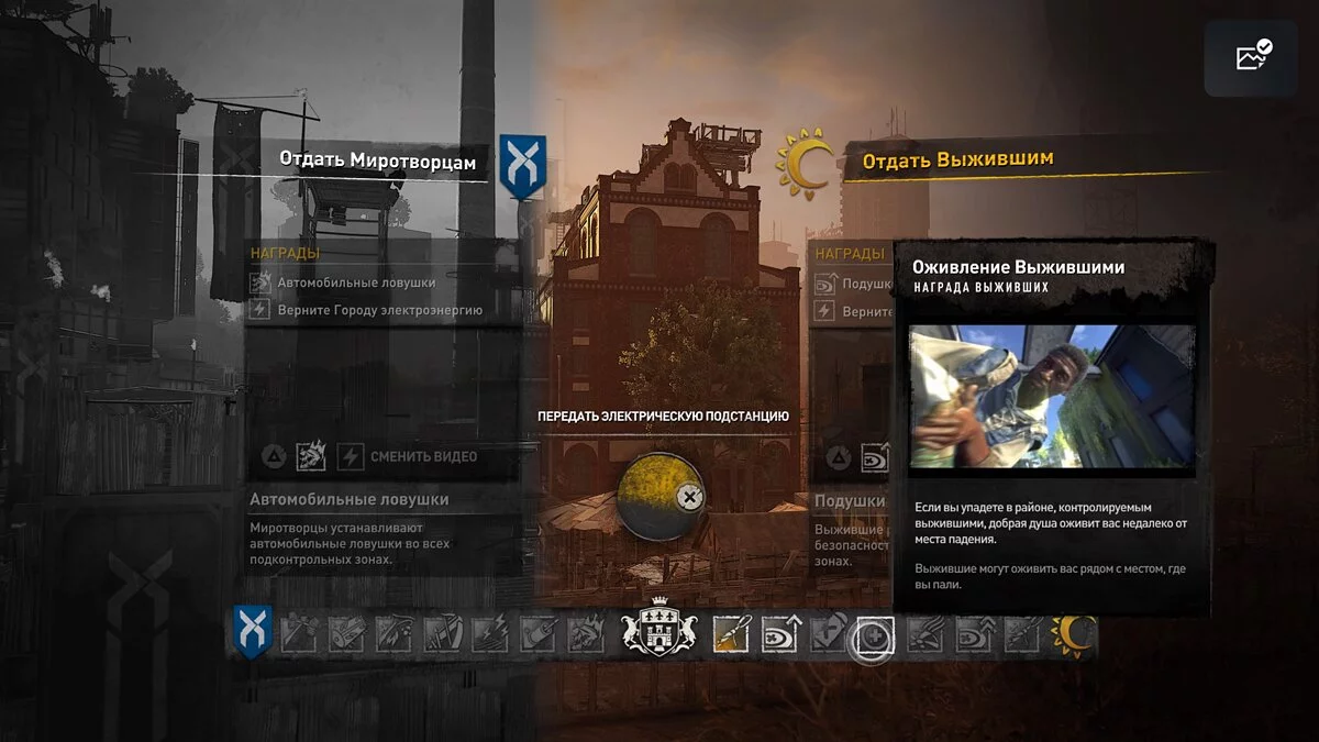 Фишка в том, что каждая группировка обещает фирменные улучшения. Выжившие установят на своих территориях больше подушек для приземления, тросов для быстрого перемещения и выпустят патрули, которые будут воскрешать героя в случае серьёзных ранений. Миротворцы же заминируют некоторые тачки, установят отгоняющие заражённых лампы и так далее. Это и есть те самые изменения, которыми хвастались разработчики, — как видите, не густо.