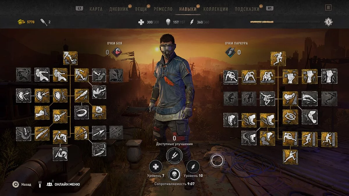 Помимо расходников потребуются ещё и очки навыков, на которые открываются перки для паркура и боёв. Система прокачки в Dying Light 2 гибридная: очки дают как за прыжки и размахивания дубиной, так и за выполненные квесты.