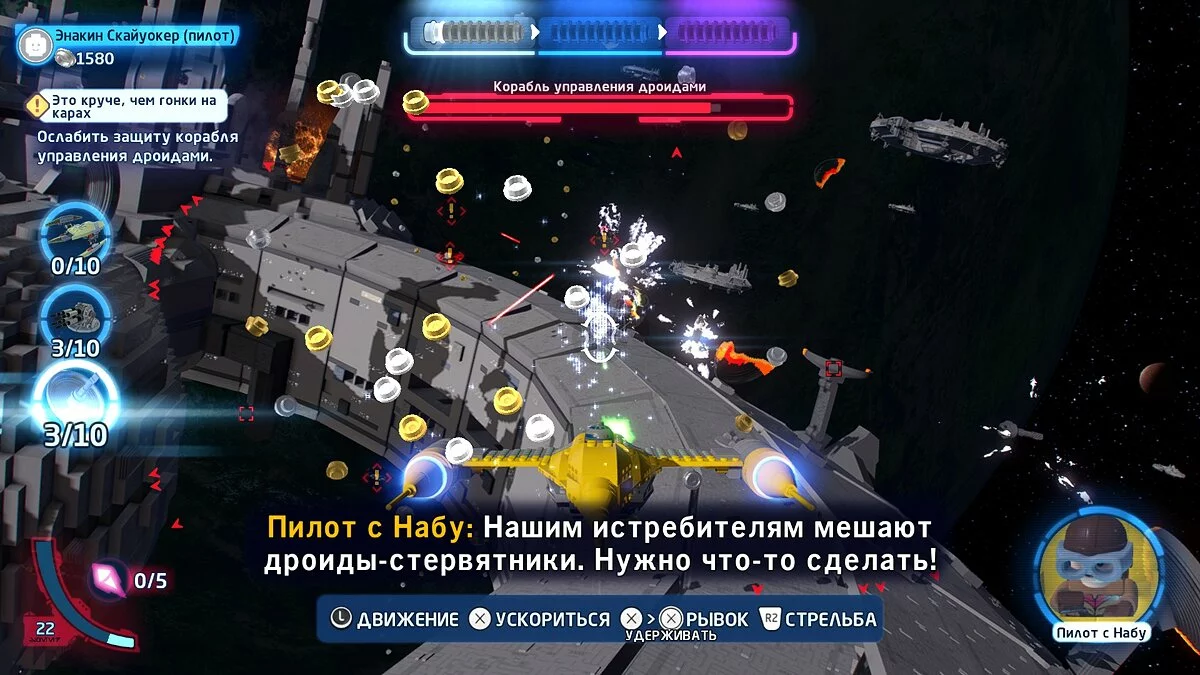 Впрочем, остальные геймплейные механики приносят не меньше удовольствия. В LEGO Star Wars: The Skywalker Saga приятно заниматься практически всем. Прятаться за укрытиями и отстреливать штурмовиков. Поднимать дронов Силой и швырять их о стену. Летать на космическом истребителе и расстреливать имперские флагманы. Гонять на подах по песчаному Татуину.