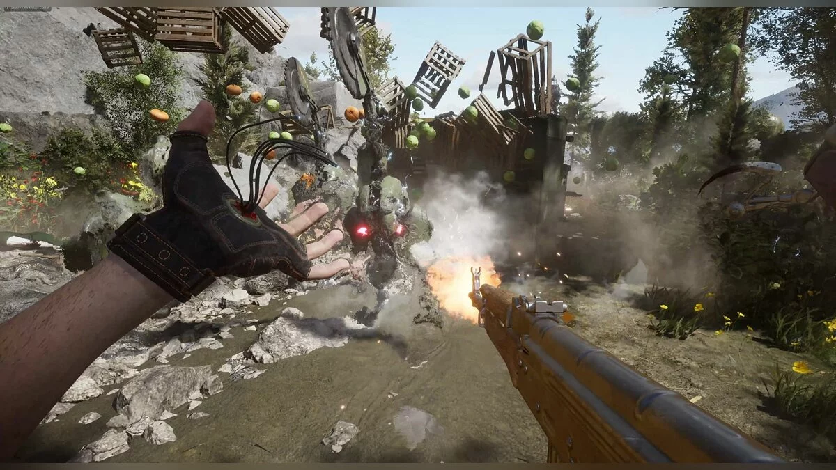 Atomic Heart — это смесь экшена от первого лица и иммерсивного симулятора. То есть в основном мы движемся строго по сюжетным рельсам, но местами сами определяем тактику достижения той или иной цели. Весь экшен построен на использовании огнестрельного, энергетического, ближнебойного оружия и болтливой перчатки.