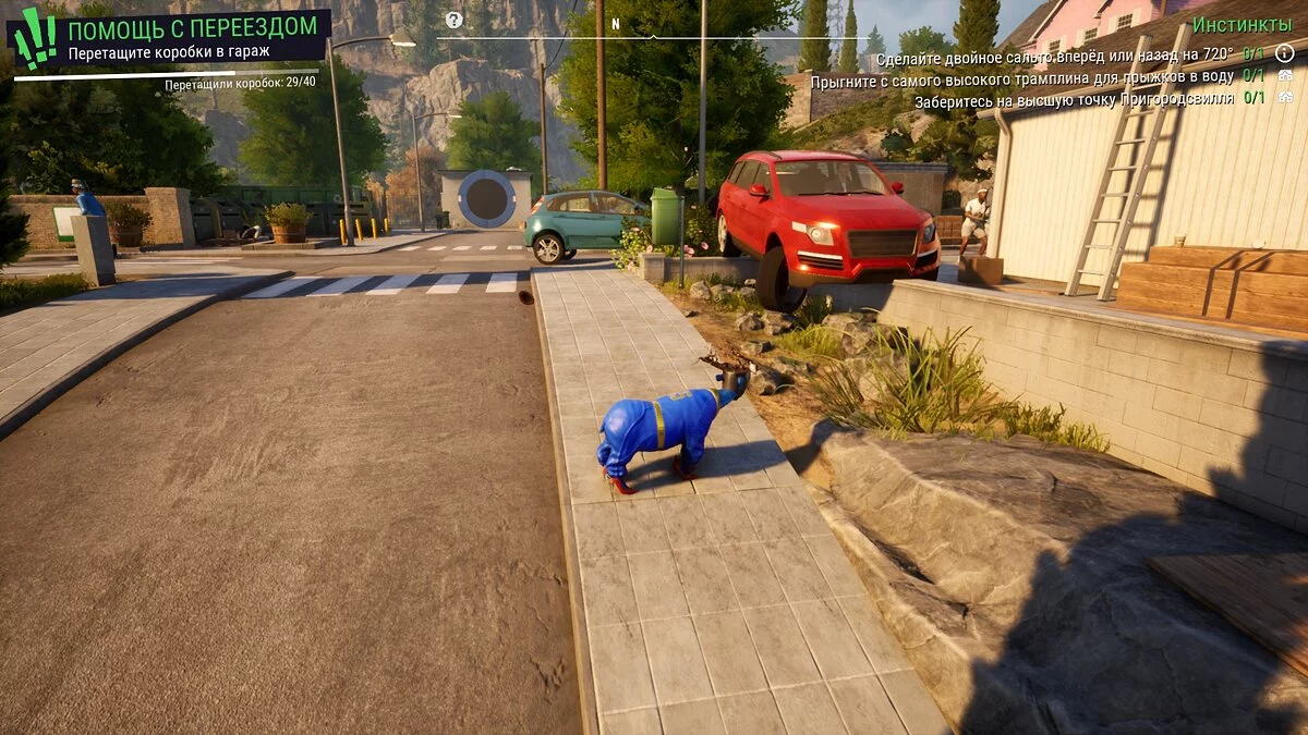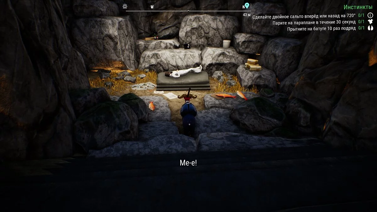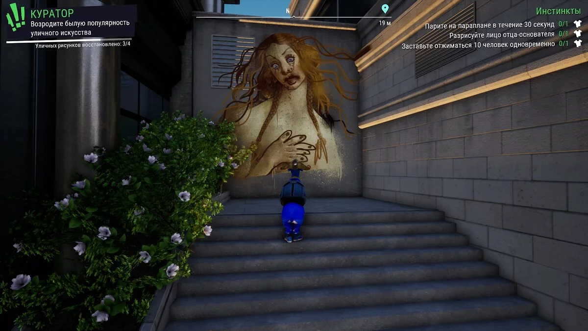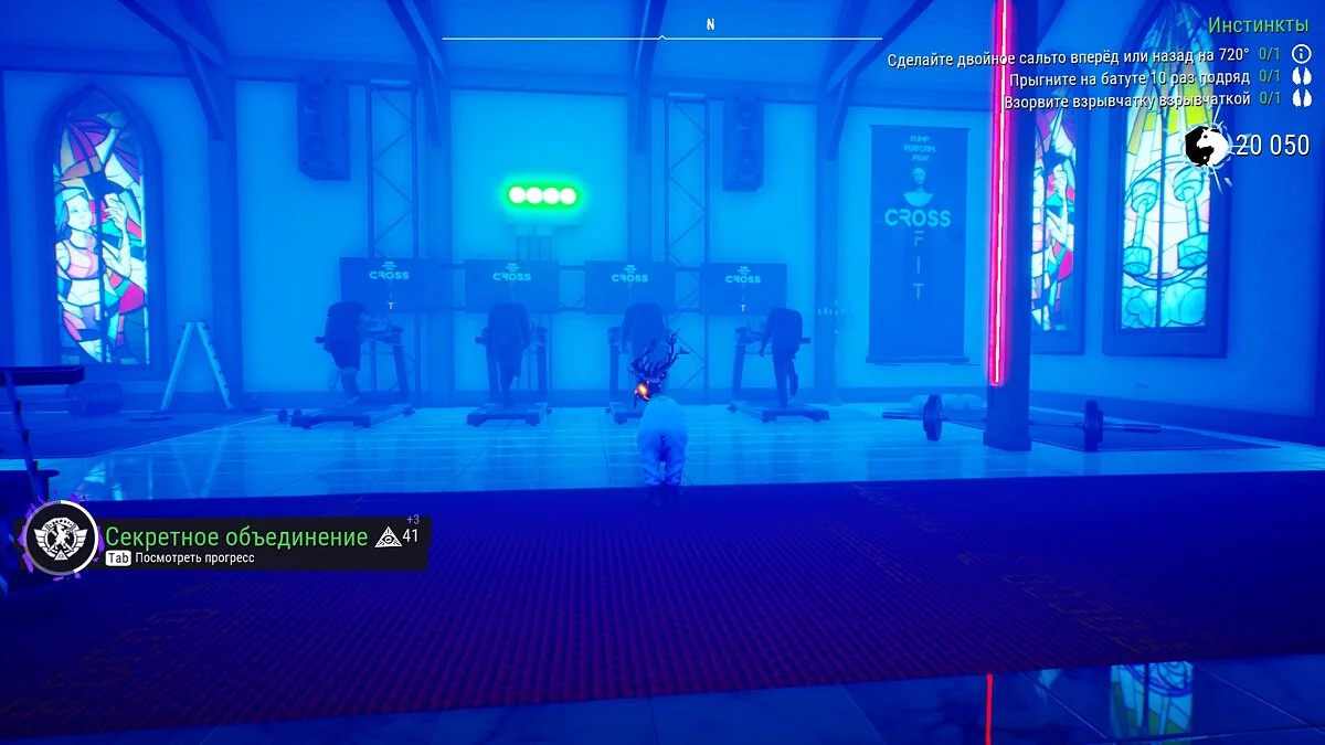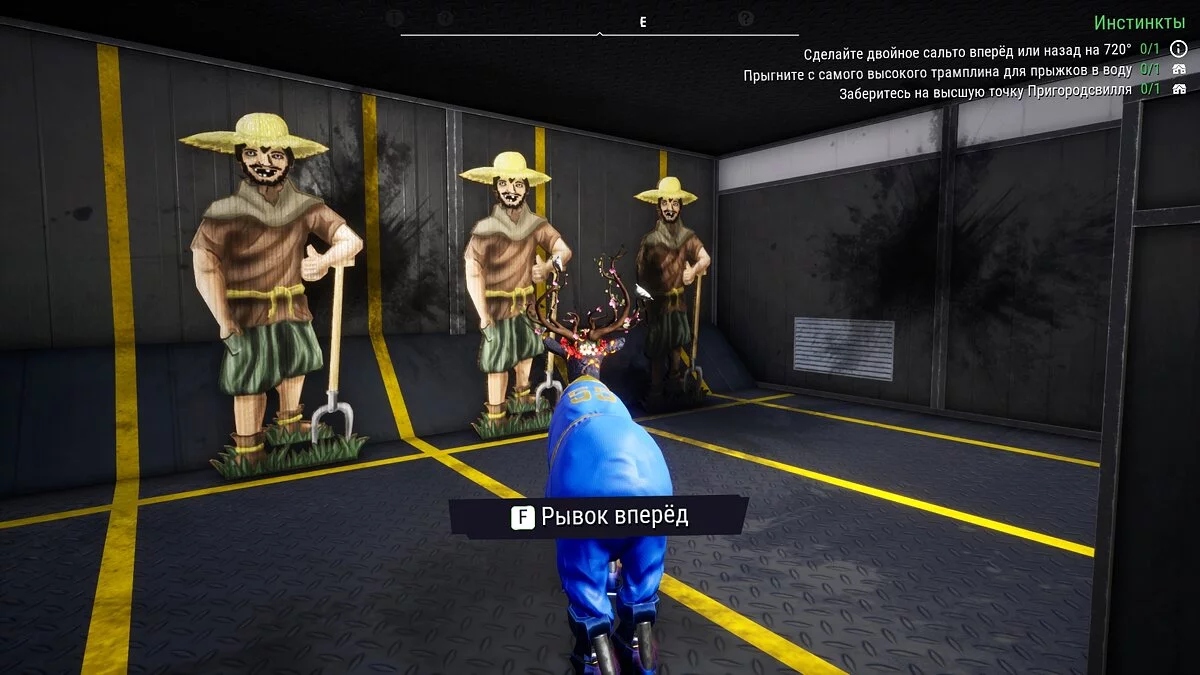 Какие-то шмотки и скины разбросаны по открытому миру, а какие-то приходится открывать, выполняя местные ачивменты — «инстинкты». Выполнять их проще, чем местные задания. Для этого разработчики заботливо оставили комментарии к каждому испытанию с подробным описанием. Прыгни столько-то раз, прокатись по проводам столько-то минут, переодень полицейского или забодай толпу прохожих… Впрочем, отвлекаться на эти задания нет никакого смысла — они сами собой выполняются в ходе изучения открытого мира и прохождения квестов.