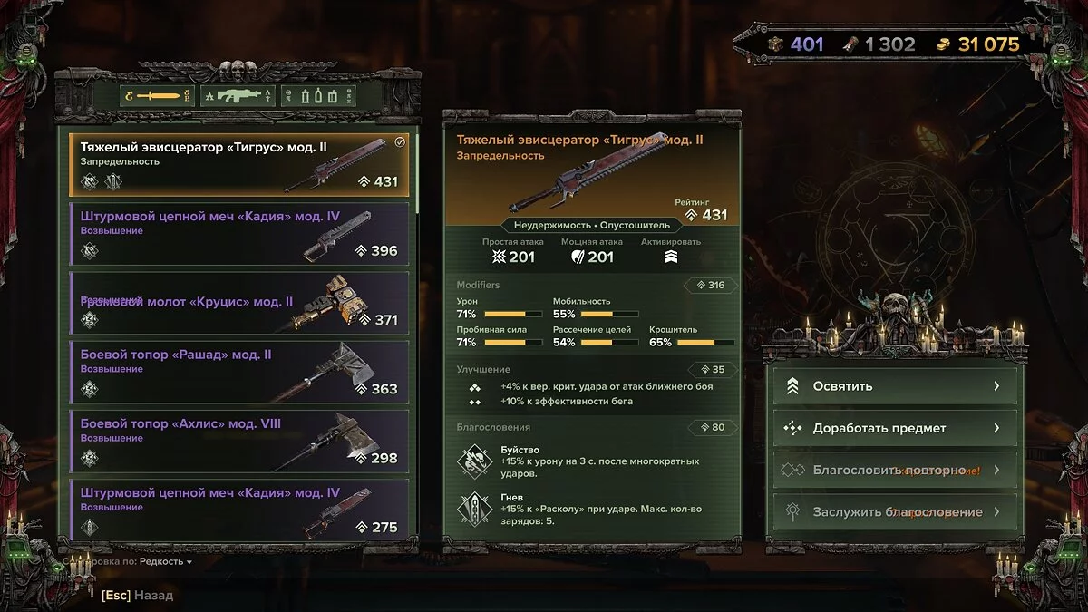 Крафт и улучшение амуниции в Darktide находятся в зачаточном состоянии. Разработчики заранее добавили в игру несколько кнопок с возможностями зачаровывания оружия, но на текущий момент работают всего две. Для улучшения имеющегося оружия необходимо обшаривать локации и собирать ресурсы. Занятие не самое увлекательное, да и желаемого эффекта от улучшения можно не добиться. Все дополнительные особенности оружия выдаются рандомно.