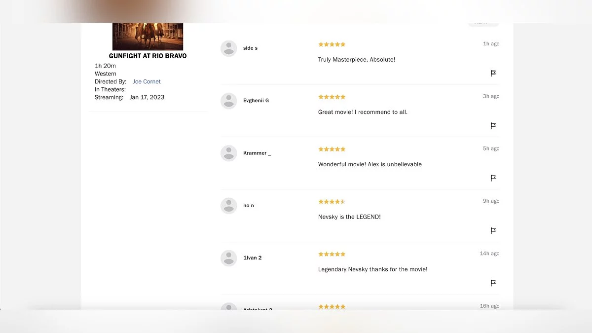 С рецензиями ситуация немного лучше, чем у «Кинопоиска» — 7 от профессиональных критиков и 9 от пользователей. Мы просмотрели их все. У пользователей почти все оценки 10/10. При этом рецензии явно шуточные, высмеивающие как самого Невского, так и его шедевр.