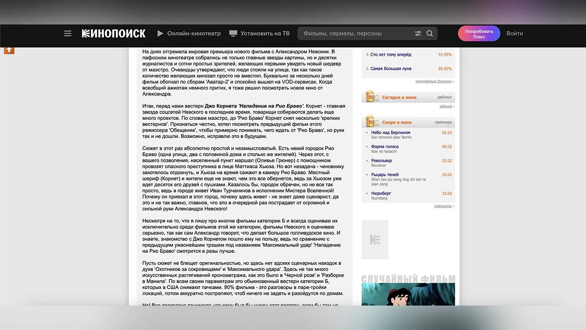 В новостях прошел слух, что «Нападение на Рио Браво» попало в Топ-250. Мы проверили, и сейчас фильма там нет. На самом сайте можно изучить, как именно формируется рейтинг. «Кинопоиск» руководствуется сложной формулой, а также учитывает оценки только тех пользователей, которые голосуют регулярно. Вывод простой — большинство баллов хит Невского получил от пользователей, которые крайне редко ставят оценки в принципе, либо вообще их не ставят. Учитывая количество рецензий — подозрительно.